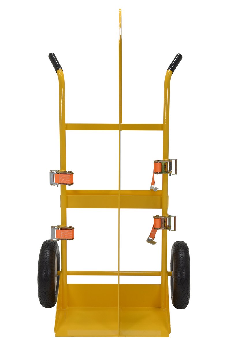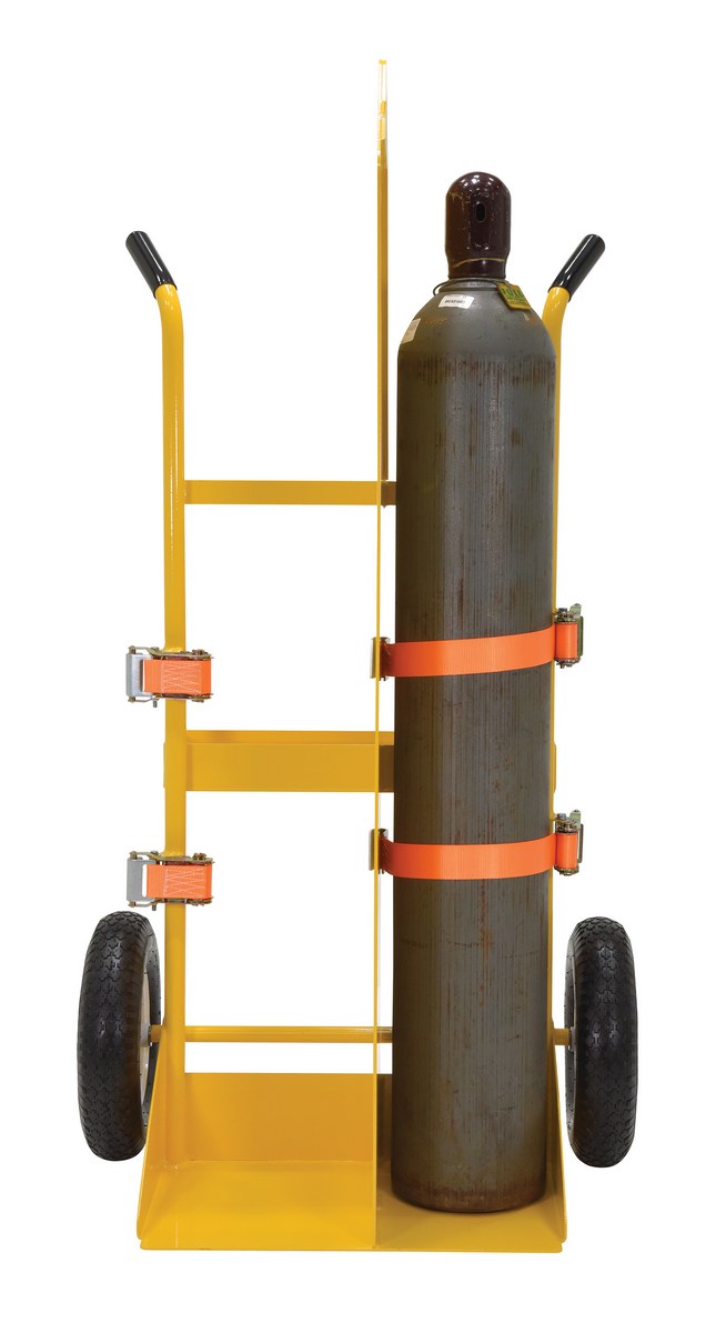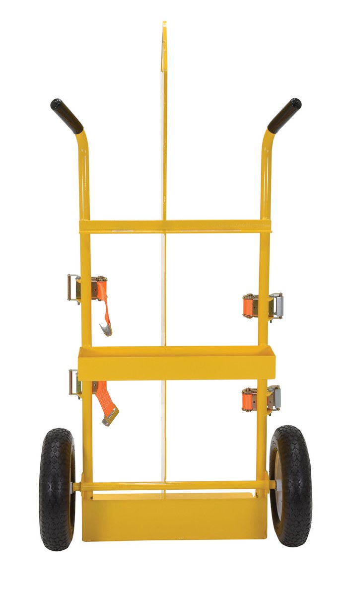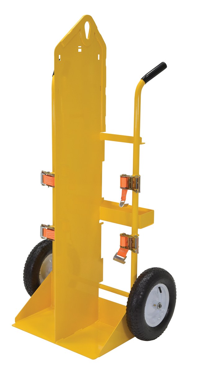 Steel Torch Cart-Lift Eye with Pneumatic Wheels 23 In. x 34-1/2 In. x 66-3/8 In. 500 Lb. Capacity YellowThe welding Cylinder torch cart is designed for transporting cylinders and cutting torch. Includes two (2) tank compartments with heavy-duty ratchet straps. Convenient open-top storage tray. Sturdy handles and large wheels for tilt-n-go portability. Welded steel construction with powder coat finish. Not designed for use as a storage means for gas cylinders.