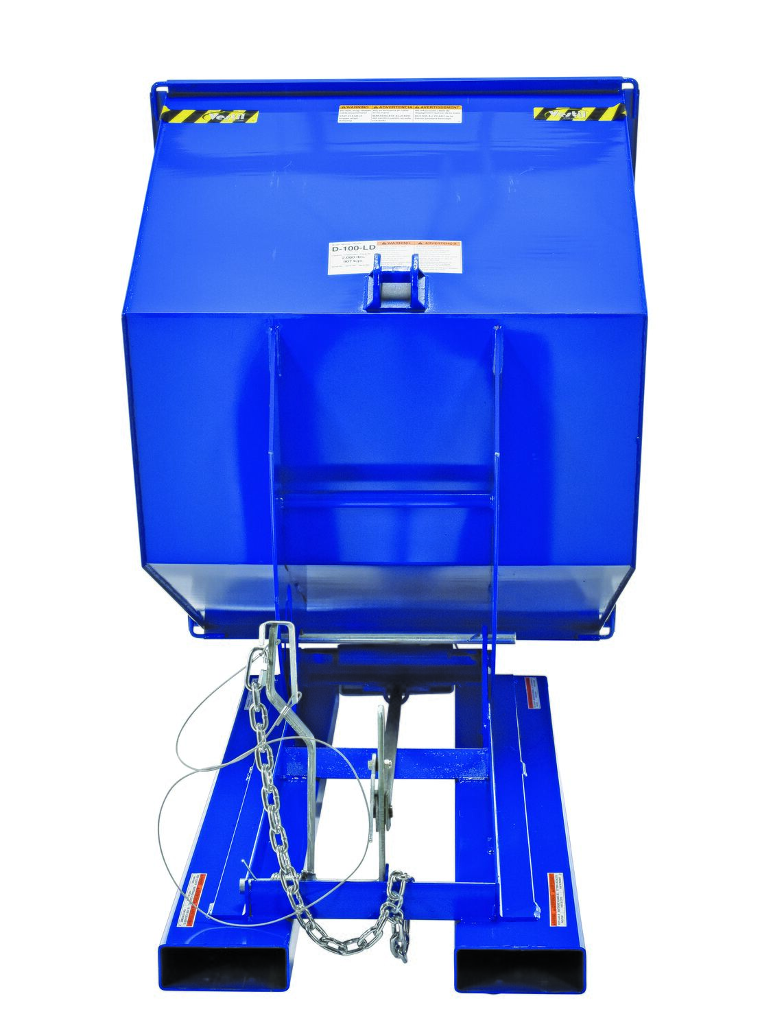 Steel Light Duty Self Dumping Hopper 1 Cubic Yard 2000 Lb. Capacity BlueThis Light Duty self-dumping steel Hopper with bumper release automatically dumps when bumper release contacts the front of the dumpster. Hopper returns to an upright and locked position automatically after it dumps. Also includes a cable that may be operated from the seat of the fork truck to manually dump the hopper. The included safety restraint should be properly secured to a fork truck before dumping. (Length dimension is measured at top of chute.) Hopper is stackable if you stack the top hopper turned ninety (90) degrees from the bottom. Self-dumping hoppers facilitate compliance with OSHA general industry rule 29 CFR 1910.178(m)(5)(iii) by allowing lift truck operators to remain at the controls of their truck throughout the dumping process.
