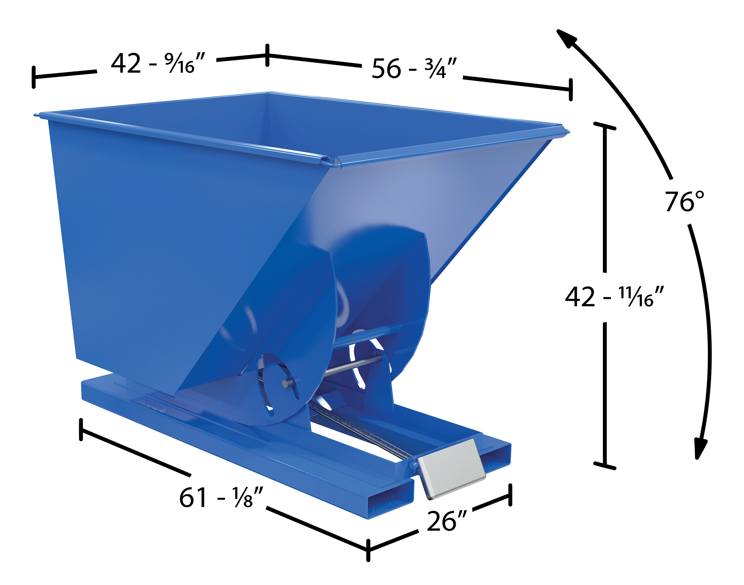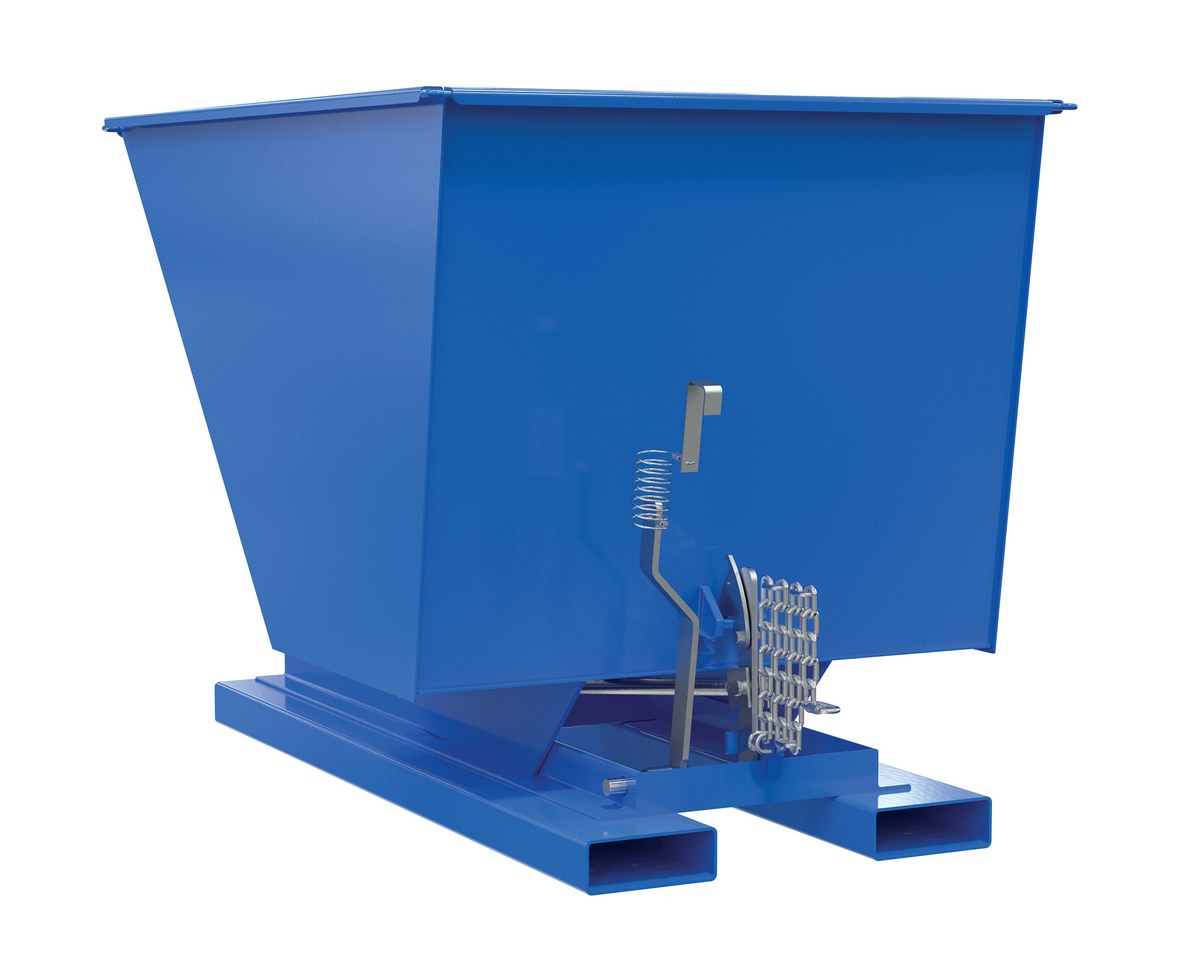 Steel Medium Duty Self Dumping Hopper 1 Cubic Yard 4000 Lb. Capacity BlueThis Medium Duty self-dumping steel Hopper with bumper release automatically dumps when bumper release contacts the front of the dumpster. Hopper returns to an upright and locked position automatically after it dumps. Also includes a cable that may be operated from the seat of the fork truck to manually dump the hopper. The included safety restraint should be properly secured to a fork truck before dumping. (Length dimension is measured at top of chute.) Hopper is stackable if you stack the top hopper turned ninety (90) degrees from the bottom. Self-dumping hoppers facilitate compliance with OSHA general industry rule 29 CFR 1910.178(m)(5)(iii) by allowing lift truck operators to remain at the controls of their truck throughout the dumping process.