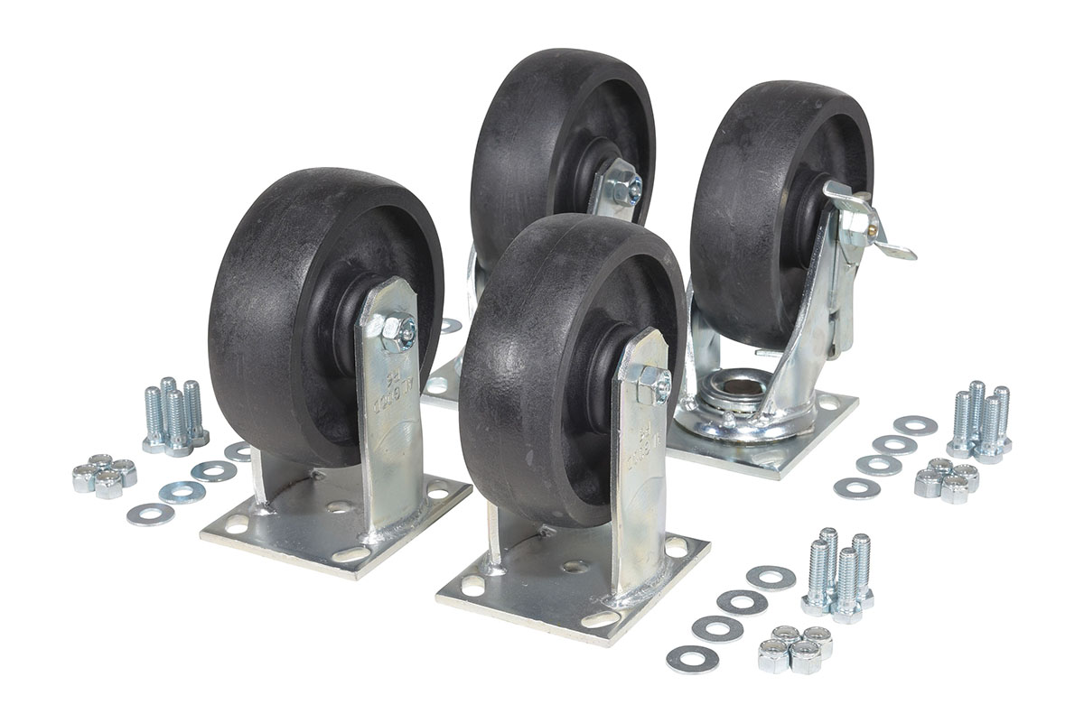 Glass-Filled Nylon Caster Kit 6 in x 2 in 5000 lb Capacity BlackMade of high-tech proprietary Glass Filled Nylon. Provides better impact resistance than standard Glass Filled Nylon. Does not absorb moisture like phenolic, and offers better floor preservation than steel or cast iron. Resists most chemicals, solvents, gases, acids and steam cleaning. Top plate measures 4 X 41/2". Black tread color. 85 (+/-5) Shore D. wheel core material is Glass Filled Nylon. Made In Canada. 3 Year warranty.