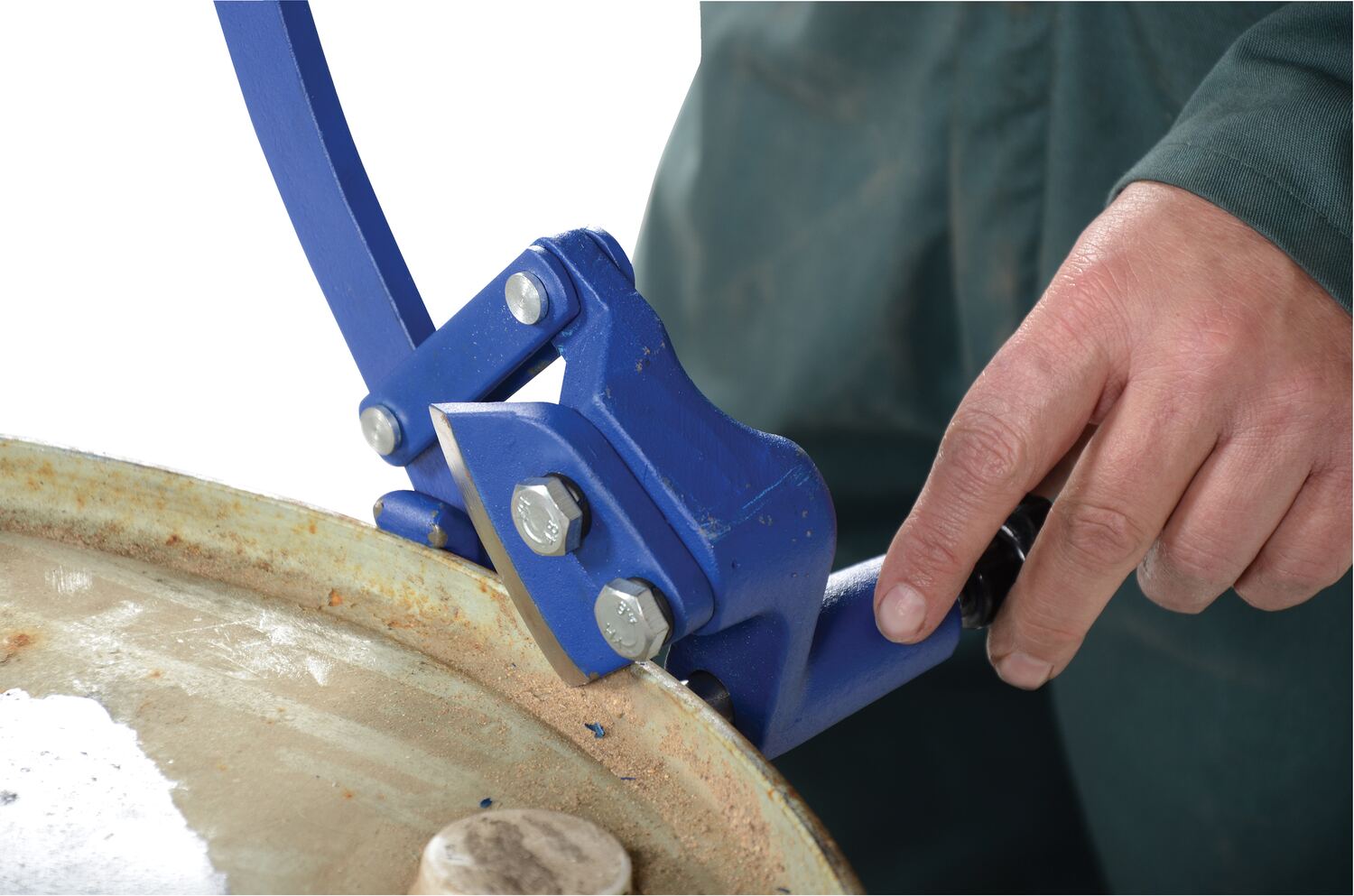 Steel Manual Drum Deheader with Blade 21 In. x 6-1/2 In. x 5-1/4 In. BlueConvert your closed head steel drums into storage containers with this manual drum Deheader. Adjustments can be made to open steel drums with different thicknesses. The blade is angled for maximum penetration and flattens the cut edge so there are no sharp or jagged edges.