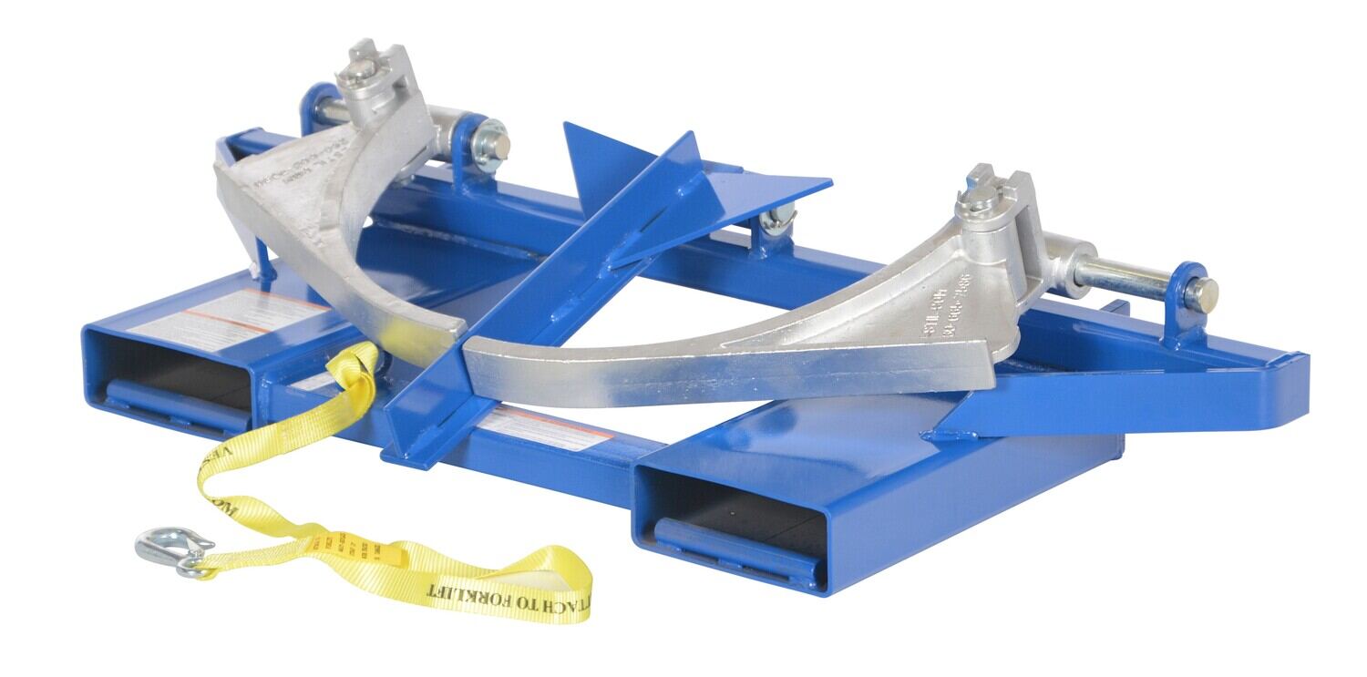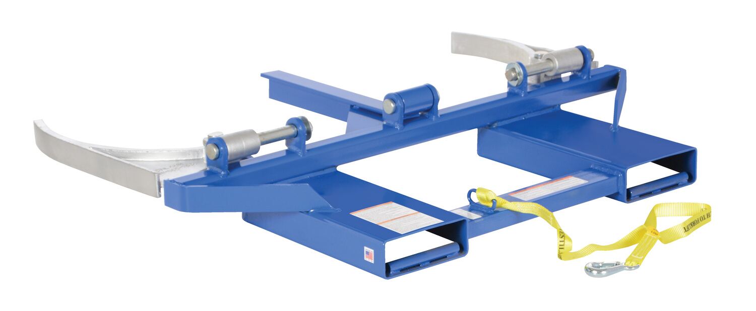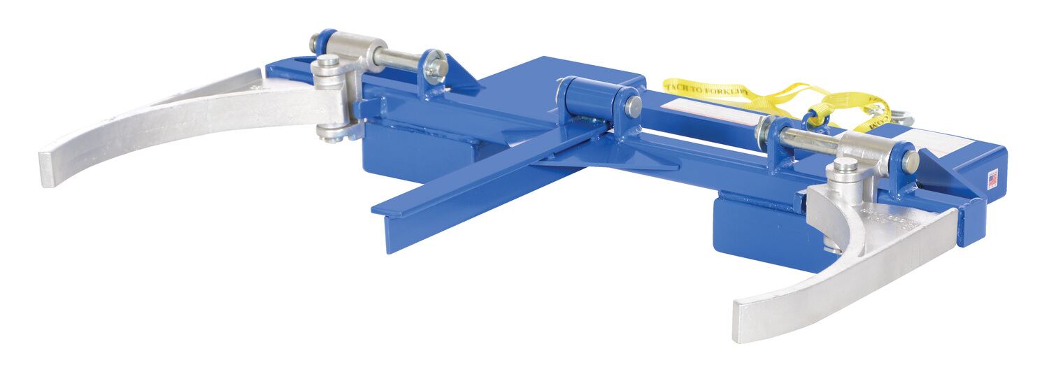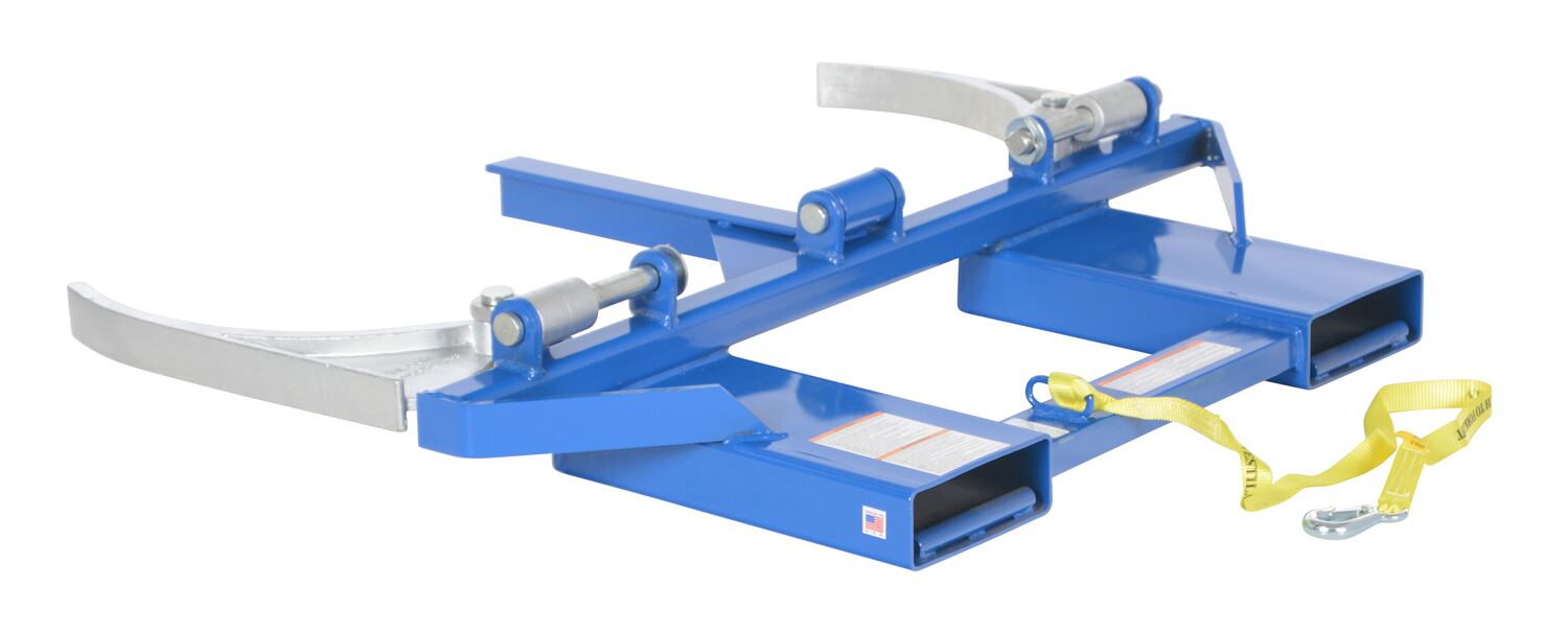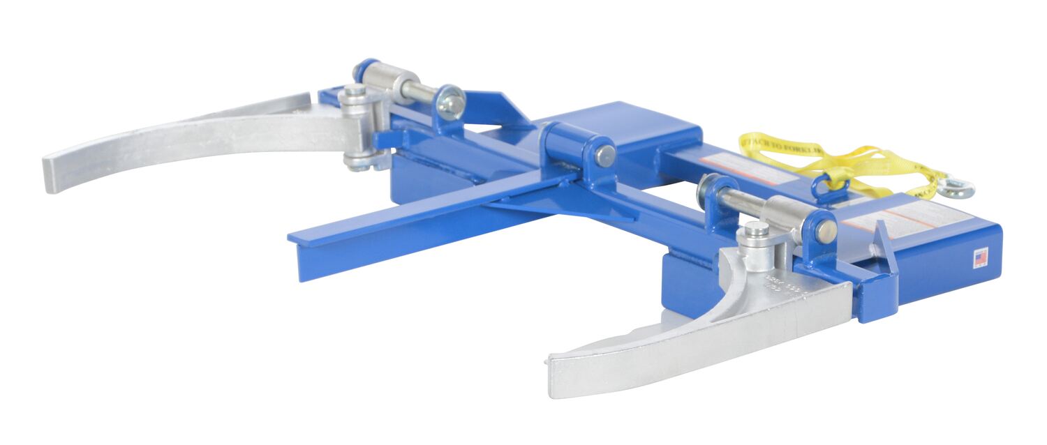 Steel Adjustable Double Drum Gripper 35 In. x 45 In. x 7-1/2 In. 1500 Lb. Capacity BlueThe drum gripper makes it easy to pick up one or two open head (with lid installed and secured) and closed head steel drum without leaving the seat of the fork truck. Simply slip the forks into the fork pocket, fasten the safety restraint and the drum gripper is ready to go. The knuckle gripping system is lowered around the drum, gripped tightly, and then lifted into the air. Drum is automatically released by lowering the forks. Features hinged folding design for storage and adjustable-width arms for use with steel drums. Safety restraint included. Welded steel construction. Powder coat finish.