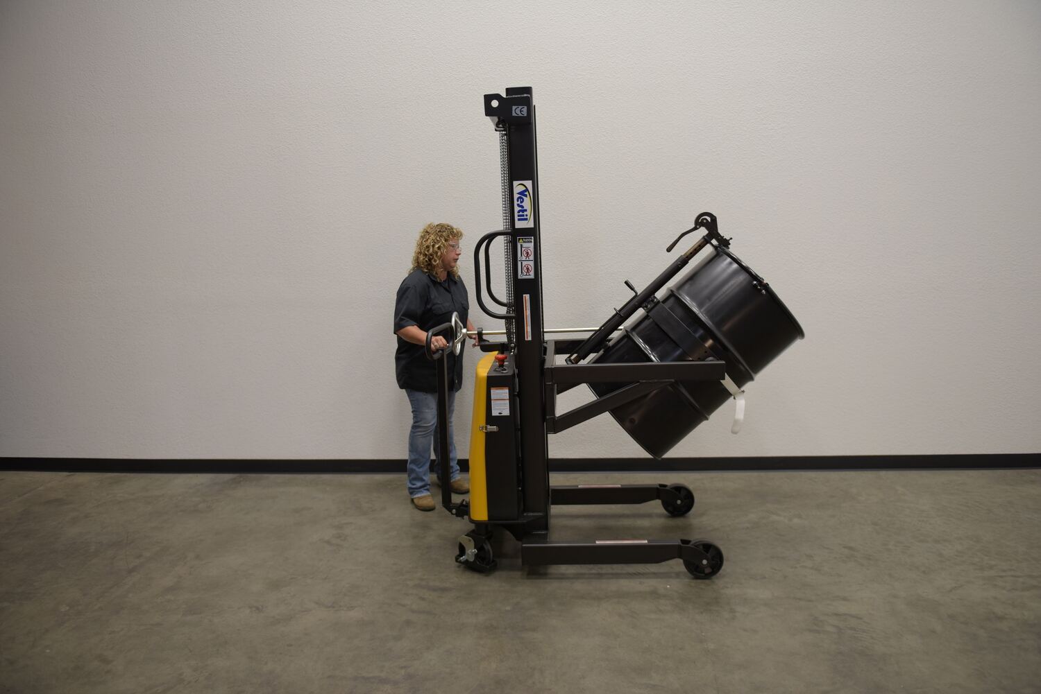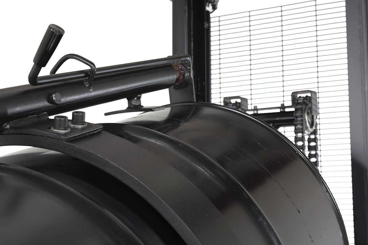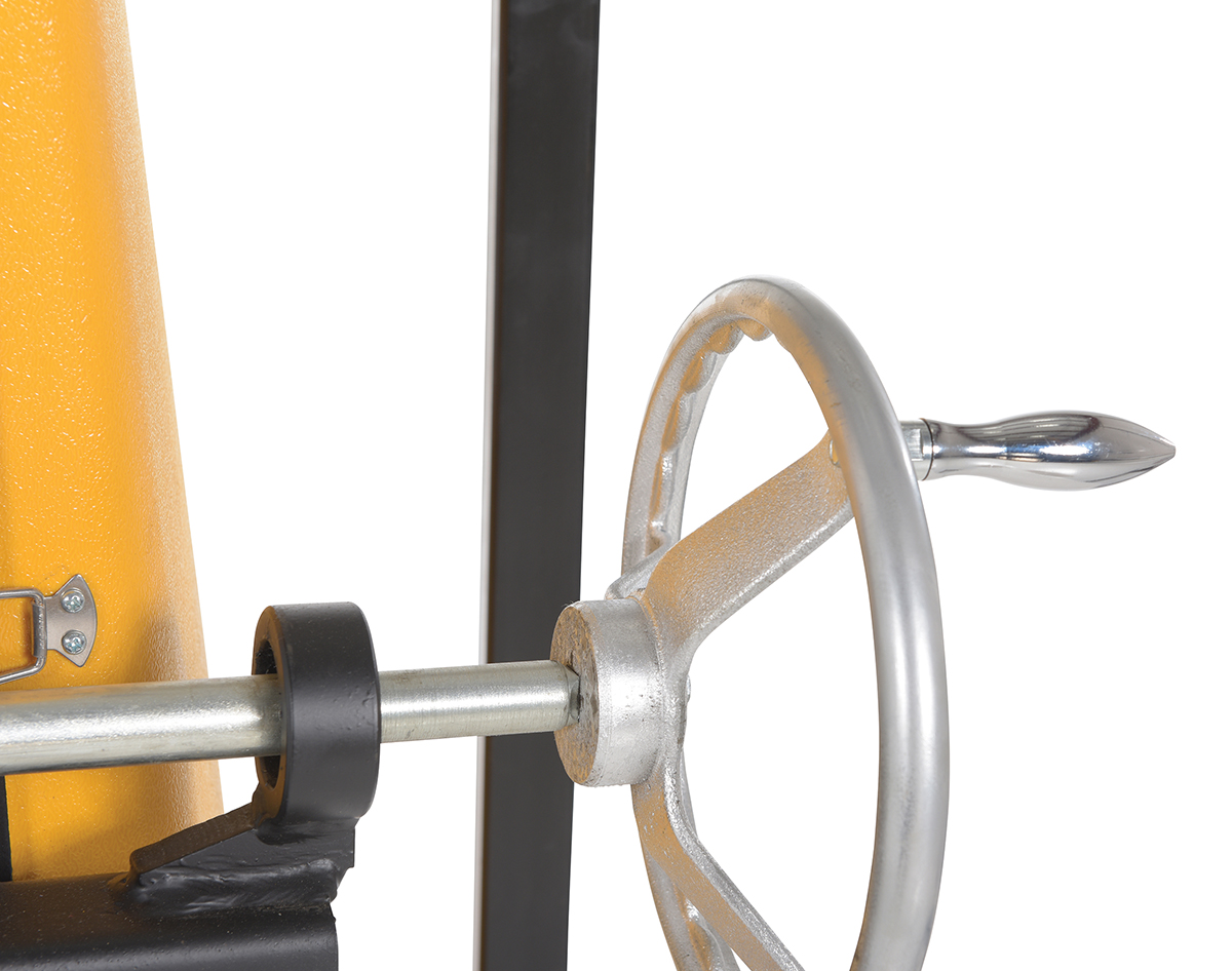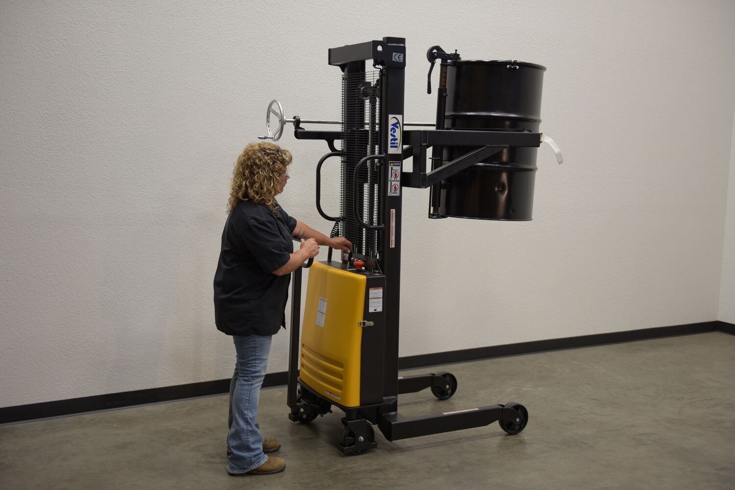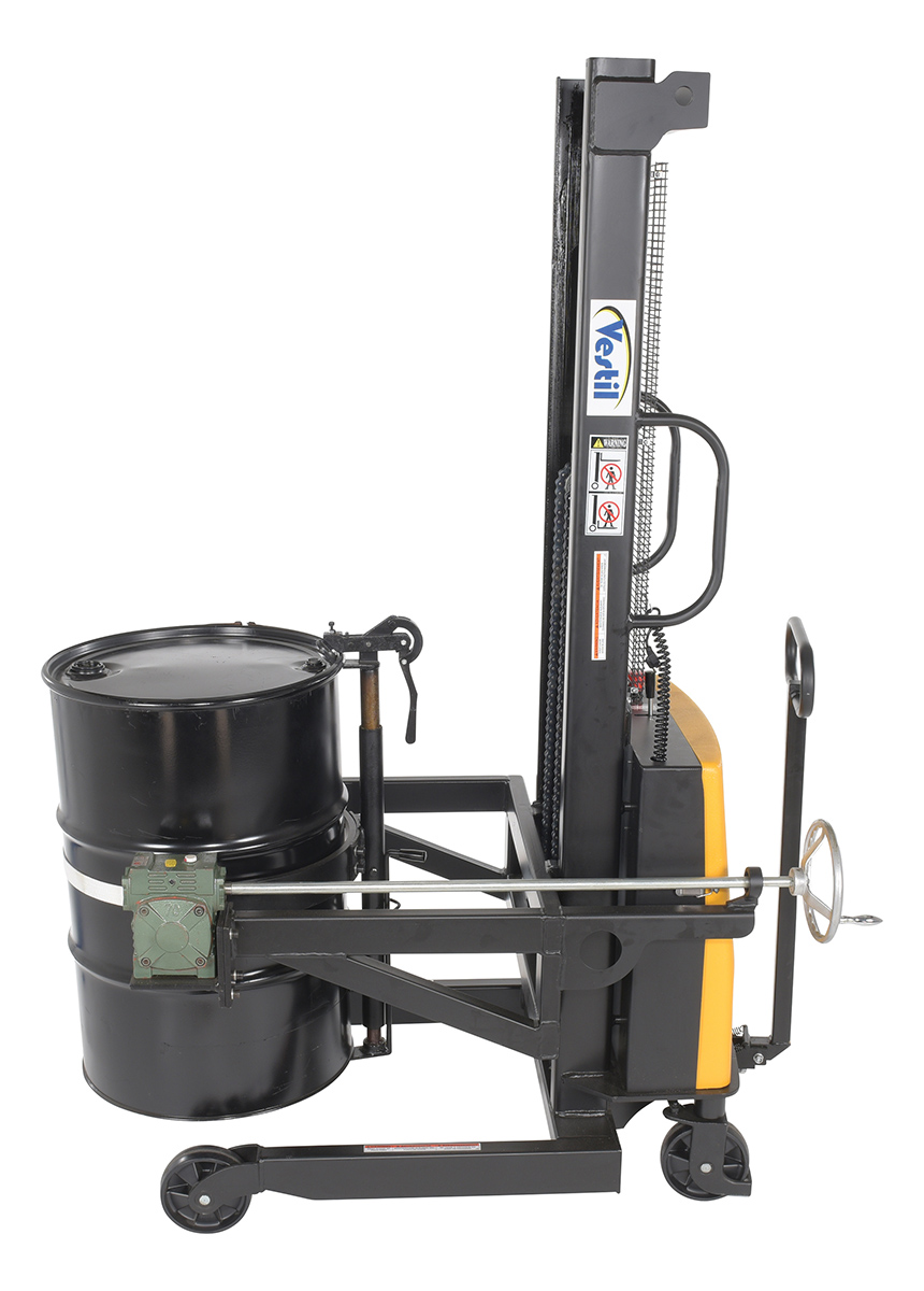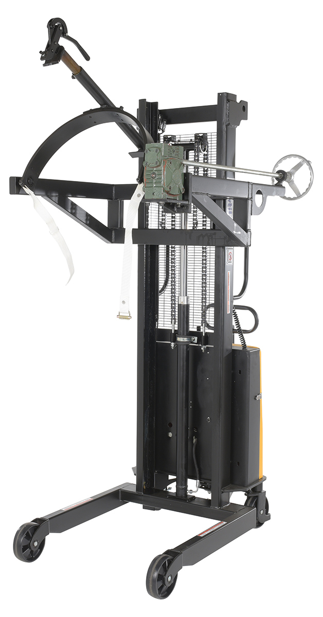 Steel DC Powered Drum Lifter/Rotator/Transporter 61 In. x 36-1/4 In. x 88 In. 550 Lb. Capacity Black/YellowA portable Drum Lifter/rotator/transporter has a DC battery powered lift operation and a manual hand crank gear mechanism rotation (on-board charger standard). For use with steel and fiber drums.