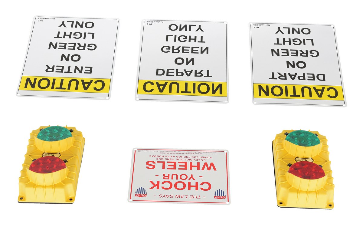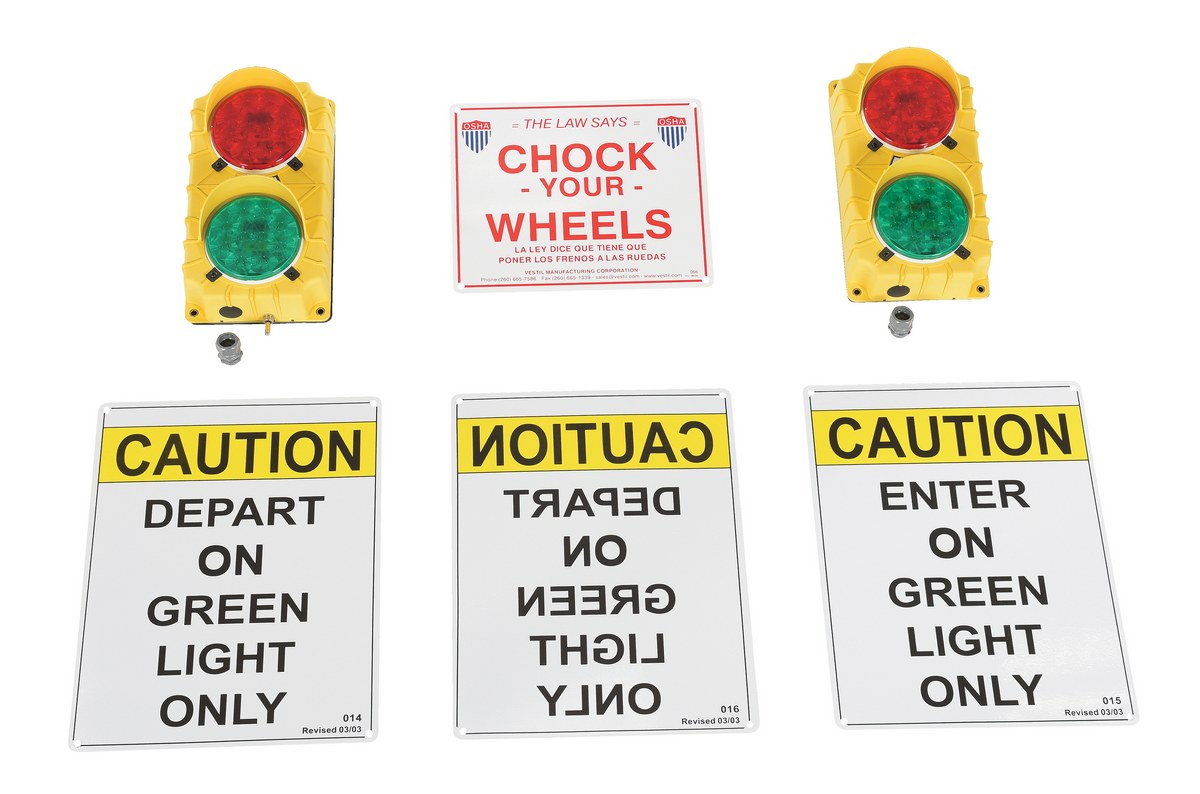 Polypropylene Traffic System Stop Go Set 24V LED 3-3/4 In. x 6-1/2 In. x 11-1/2 In. YellowOur dock traffic systems feature flashing red and green lights. Prevent accidents and injuries by providing clear communication between dock personnel and truck drivers. Built-in eyebrow type sun visors increase light visibility. Economy, model DTS-5, comes with two (2) yellow polypropylene traffic lights, 6."W x 11."H, each having a green and a red lens. The light containing a push button is placed inside the dock area for the dock attendant, and the other is placed outside for the truck driver. Four (4) signs are included. LED model never needs bulb replacements.