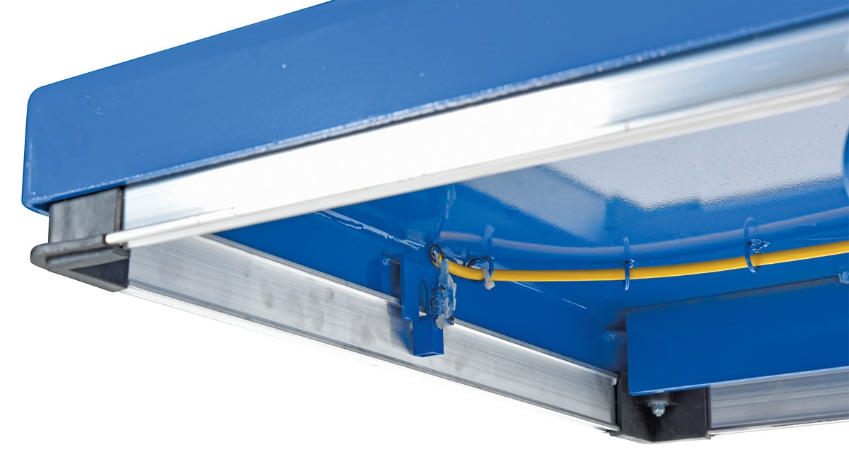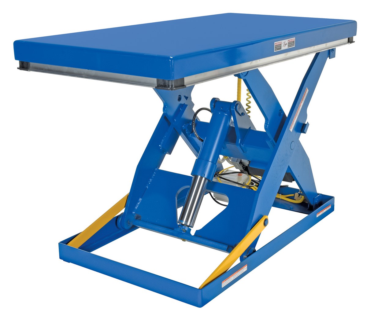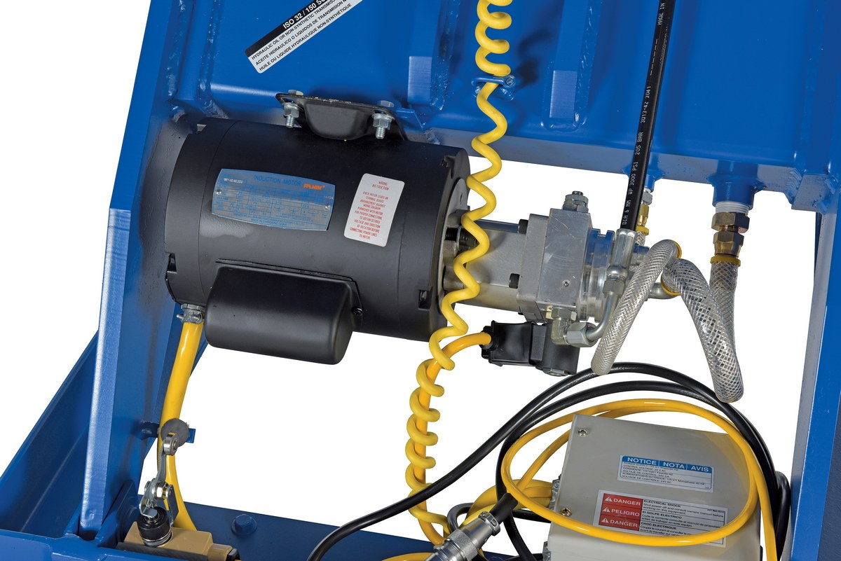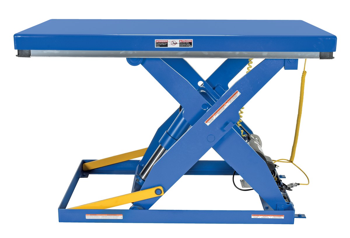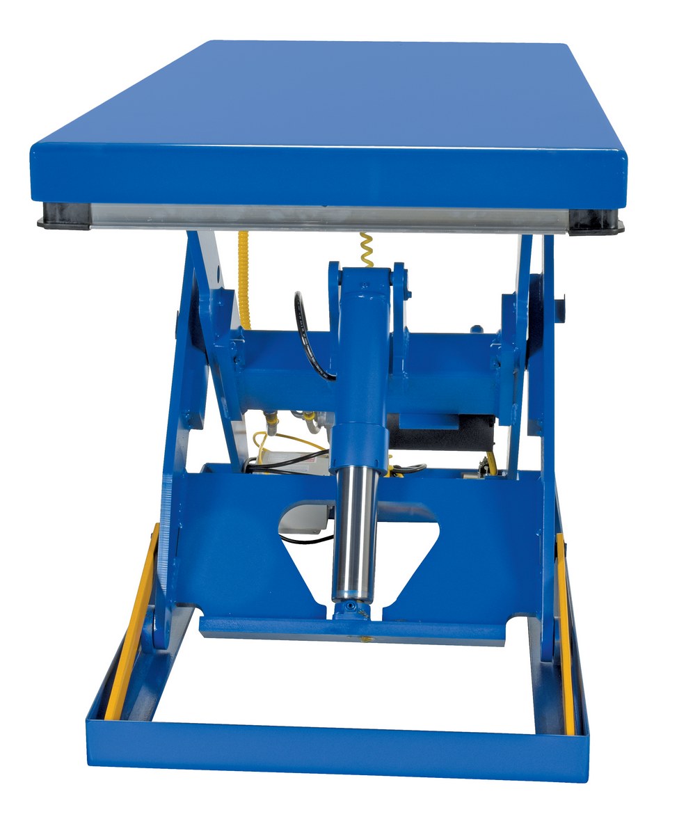 Steel Electric Hydraulic Lift Table 30 In. x 60 In. 3000 Lb. Capacity BlueThe electric hydraulic scissor lift table is used by all types of manufacturing and warehouse facilities. Safety features include a patented pinch point perimeter toe guard to protect pinch points while lowering the table, fused push button control, internal safety velocity fuse to maintain platform height in the event of hose or fitting failure, integral maintenance prop, adjustable upper travel limit switch to stop the table at maximum height, and displacement-style hydraulic cylinders for maximum strength. It also features a pressure plated pump, manifold system, and state-of-the-art lifetime lubricated bearings. The standard 56 frame electric motor is fully enclosed with additional voltage options available. Contact factory if platform dimensions are crucial.