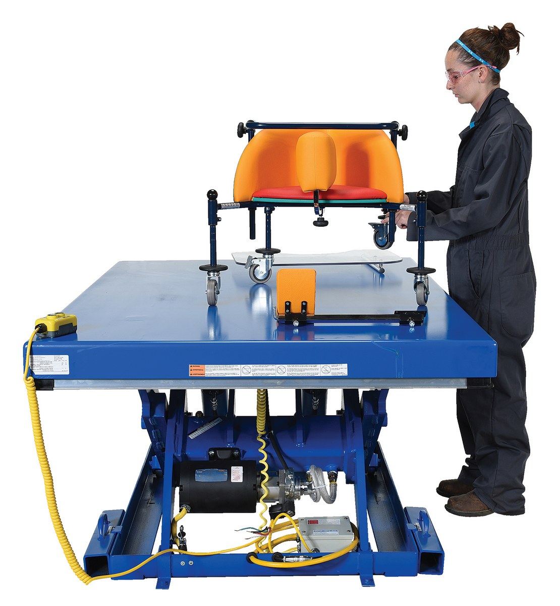 The electric hydraulic scissor lift table is used by all types of manufacturing and warehouse facilities. Safety features include a patented pinch point perimeter toe guard to protect pinch points while lowering the table, fused push button control, internal safety velocity fuse to maintain platform height in the event of hose or fitting failure, integral maintenance prop, adjustable upper travel limit switch to stop the table at maximum height, and displacement-style hydraulic cylinders for maximum strength. It also features a pressure plated pump, manifold system, and state-of-the-art lifetime lubricated bearings. The standard 56 frame electric motor is fully enclosed with additional voltage options available. Contact factory if platform dimensions are crucial.