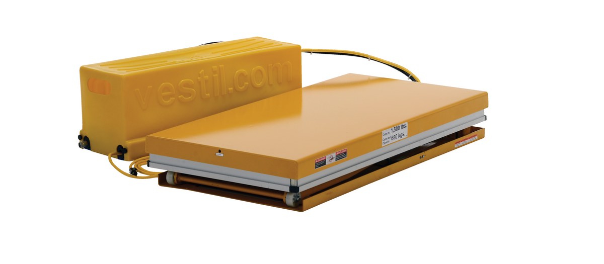 Steel Work Station Electric Hydraulic Scissor Table 24 In. x 48 In. 1500 Lb. Capacity YellowThe work station electric hydraulic scissor table is designed to raise products up to an ergonomic working height. It maximizes safety with minimum space requirements and is ideal for all types of manufacturing and warehouse facilities. The external power unit can be located eight (8) feet away from the unit and comes with a standard hand control. An electric toe guard also comes standard with the unit.