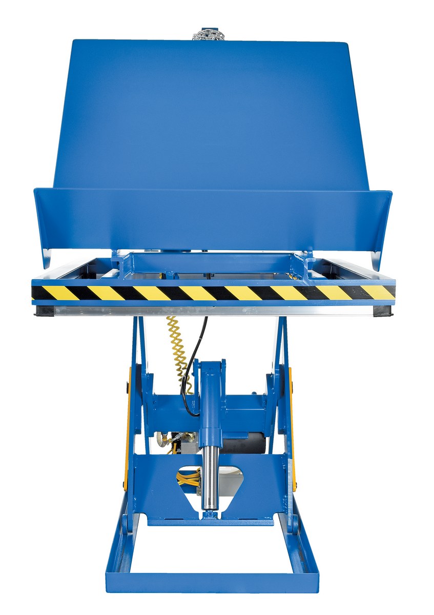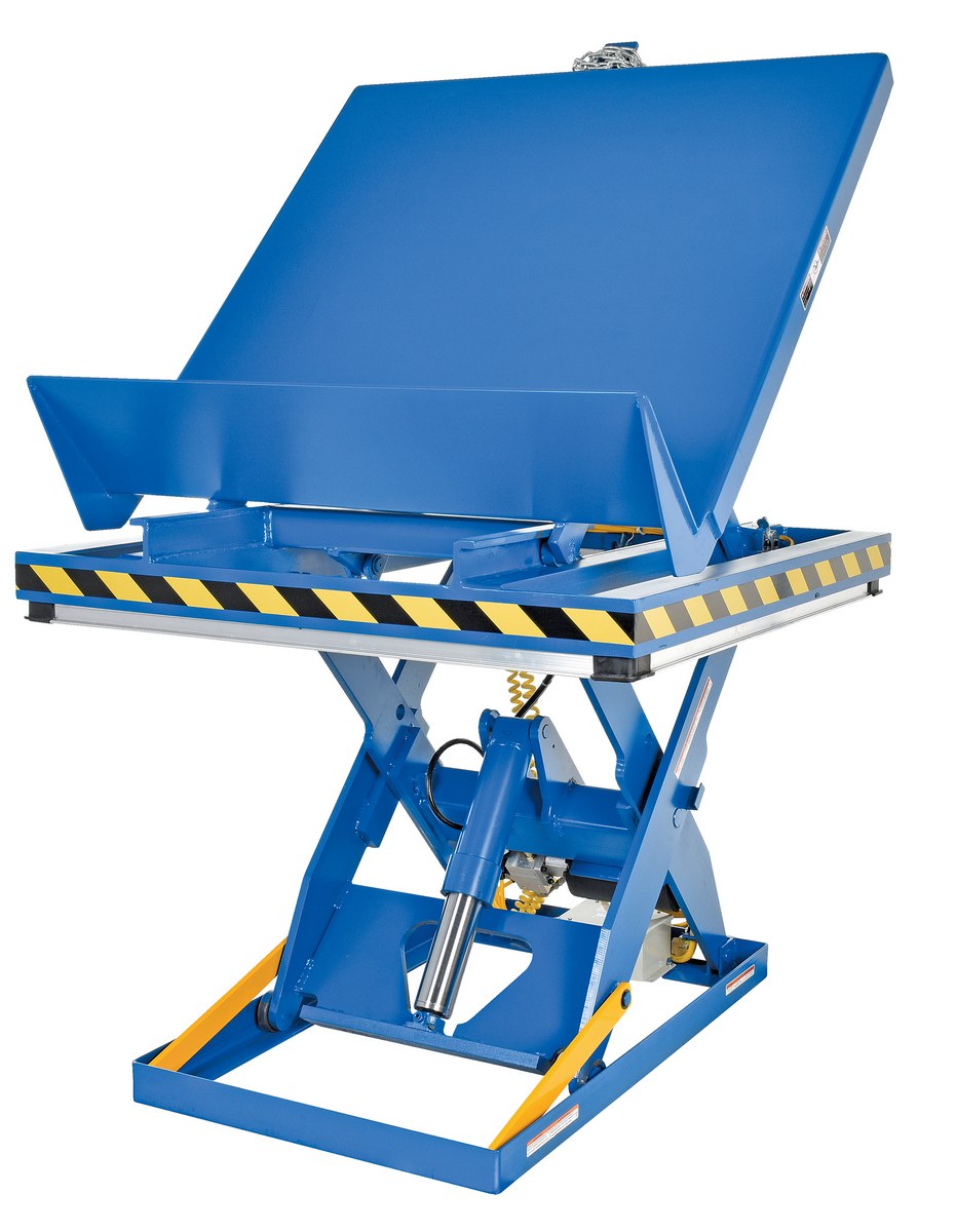 Steel Lift and End Tilt Scissor Table 48 In. x 48 In. 2000 Lb. Capacity BlueThe lift and tilt scissor lift performs both lifting and tilting operations. There is a restraining chain and lip to keep the load in place during tilting. Safety features include an electric toe guard to protect workers from pinch points during lowering of table, velocity fuses to hold platform position in the event of a hose or fitting failure, four (4) push-button hand pendent control, upper limit switch to stop travel at maximum height and reduce motor wear, and maintenance prop. The end tilt is standard with a side tilt available. There is optional accordion skirting available for both the lifting and tilting portions of the table.
