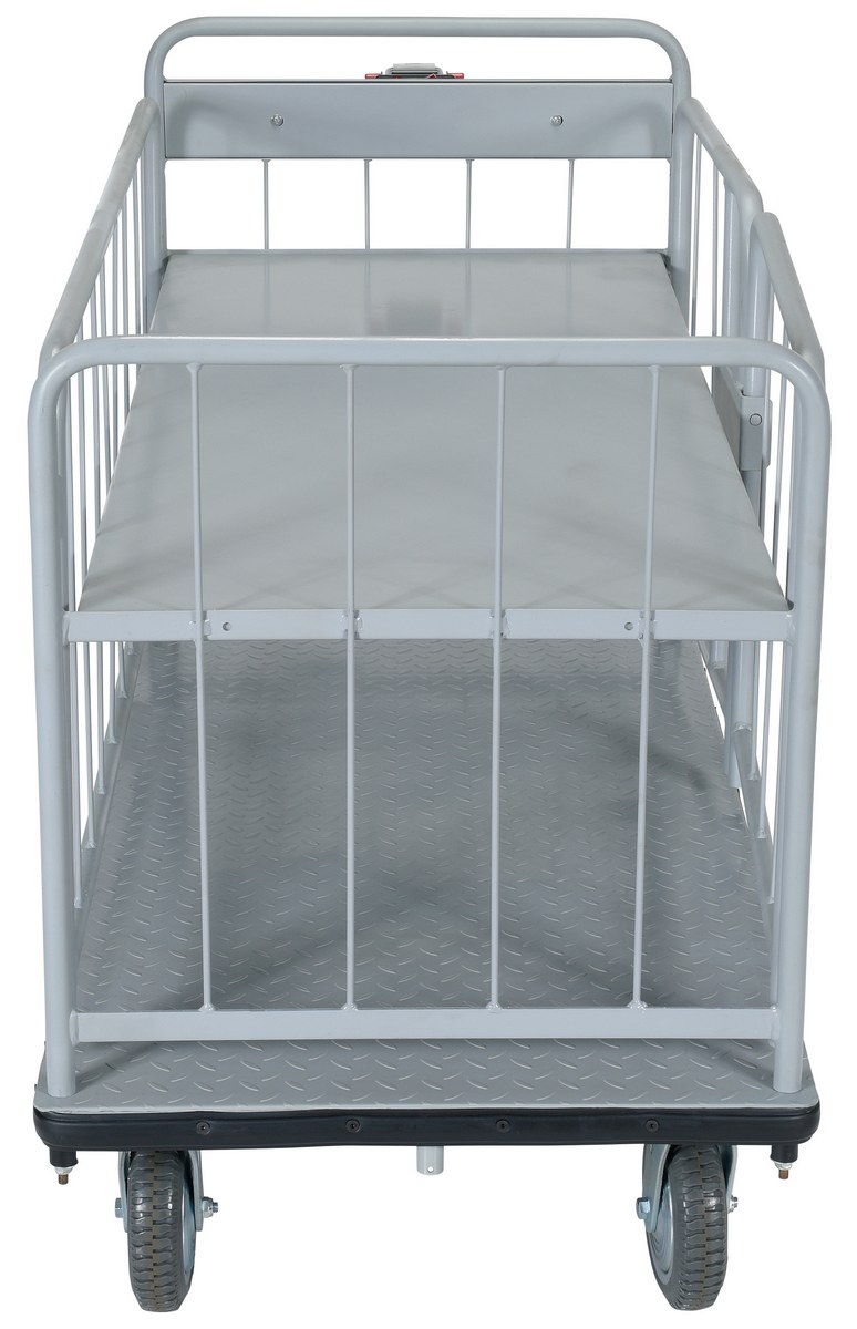 Steel Electric Material Handling Cart with Sides 1 Shelf 28 In. x 60 In. 1,500 Lb. Capacity GrayElectric material handling carts are ideal for moving heavy loads safely and easily throughout warehouses, offices, schools, and hospitals and incorporates a multitude of features to make light work of heavy loads. Reduce injury and increase productivity with these high quality carts. Features an 800W electric drive motor with (2) two 12V batteries for power and on-board 115V AC battery charger. The handle includes forward and reverse throttle control levers, an emergency reverse switch, a battery level gauge, and a slow/fast speed switch. Pinpoint turning is accurate with the mid-axle drive feature.