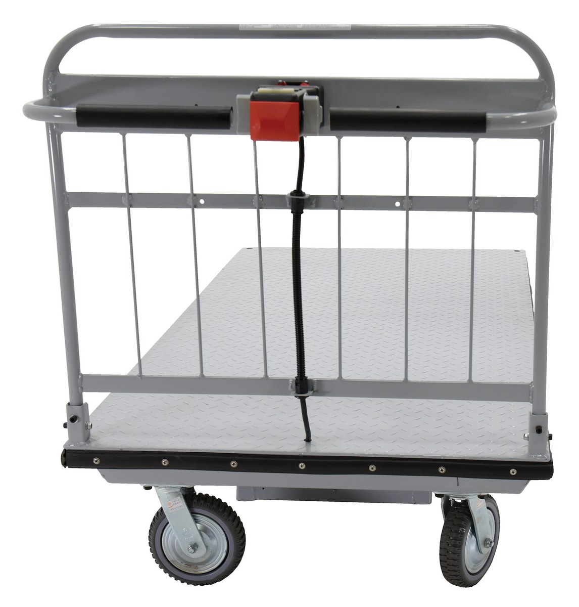 Electric material handling carts are ideal for moving heavy loads safely and easily throughout warehouses, offices, schools, and hospitals and incorporates a multitude of features to make light work of heavy loads. Reduce injury and increase productivity with these high quality carts. Features an 800W electric drive motor with (2) two 12V batteries for power and on-board 115V AC battery charger. The handle includes forward and reverse throttle control levers, an emergency reverse switch, a battery level gauge, and a slow/fast speed switch. Pinpoint turning is accurate with the mid-axle drive feature.
