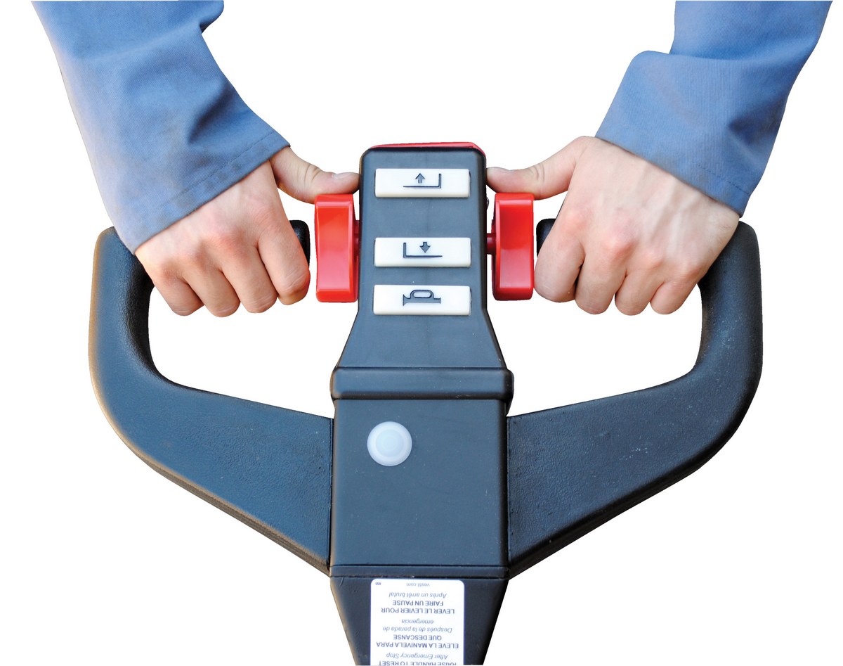 The fully powered electric pallet truck has an easy and quick operation. The unit raises and lowers loads with a push of a button. It can maneuver loads in warehouses and trailers. The reinforced welded forks have adjustable tie-rods that provide long service. The high-torque DC drive and lift motors handle heavy-duty jobs. Pallet truck includes integral battery charger, battery level gauge, and emergency battery disconnect. The truck rolls smoothly on poly-on-steel, steer and load wheels. Ergonomic handle features easy to operate throttle with infinite adjustment of forward and reverse speeds, lift/lower controls, proprietary safety-enhancing emergency reverse function, and horn. When the proprietary safety-enhancing emergency reverse function is actuated, the emergency reverse belly switch instantly reverses direction and moves the unit forward (away from the operator) until the switch is released or after 1.5 seconds have elapsed. The built-in safety circuit will automatically disable the entire unit if the emergency reverse belly switch is activated for more than 1.5 seconds after which the unit must be re-set to return to normal operating conditions. This state-of-the-art safety device provides a high degree of operator protection. Includes an electromagnetic disc brake with automatic dead-man feature that activates when the user releases the handle.