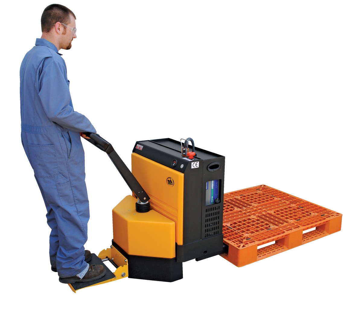 Steel Pallet Truck with Rider Platform 27 In. x 48 In. 4500 Lb. Capacity BlackThe fully powered electric pallet truck has an easy and quick operation. The unit raises and lowers loads with a push of a button. It can maneuver loads in warehouses and trailers. The reinforced welded forks have adjustable tie-rods that provide long service. The high-torque DC drive and lift motors handle heavy-duty jobs. Unit includes integral battery charger, battery level gauge, and emergency battery disconnect. The truck rolls smoothly on poly-on-steel, steer and load wheels. Ergonomic handle features easy to operate throttle with infinite adjustment of forward and reverse speeds, lift/lower controls, proprietary safety-enhancing emergency reverse function, and horn. When the proprietary safety-enhancing emergency reverse function is actuated, the emergency reverse belly switch instantly reverses direction and moves the unit forward (away from the operator) until the switch is released or after 1.5 seconds have elapsed. The built-in safety circuit will automatically disable the entire unit if the emergency reverse belly switch is activated for more than 1.5 seconds after which the unit must be re-set to return to normal operating conditions. This state-of-the-art safety device provides a high degree of operator protection. Includes an electromagnetic disc brake with automatic dead-man feature that activates when the user releases the handle. Also includes a stand-on platform, which flips up when not in use.