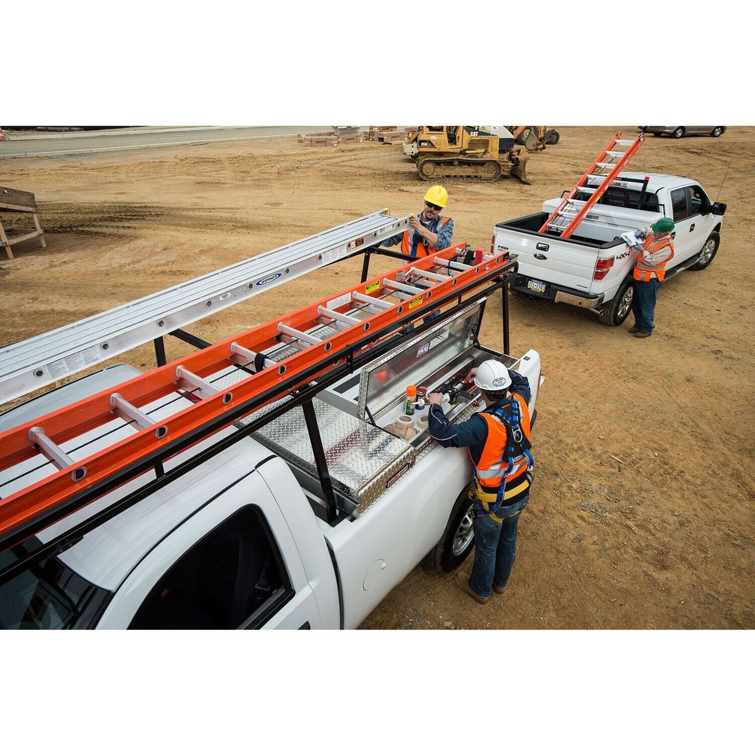 Fiberglass Extension Ladders with Aluminum Rings 28 Step 300 Lb. Capacity OrangeThis extension ladder is consistently adaptable to each setting. Whether it is being use inside or outdoors the integrity of the ladder does not waiver. With a robust 300 lbs. uniform capacity this ladder can be used in a variety of workplaces or at home. Each ladder also has a premium full metal plate that is wrapped around the rail for protection and stability. A hard-wearing polypropylene pulley rope is also included.