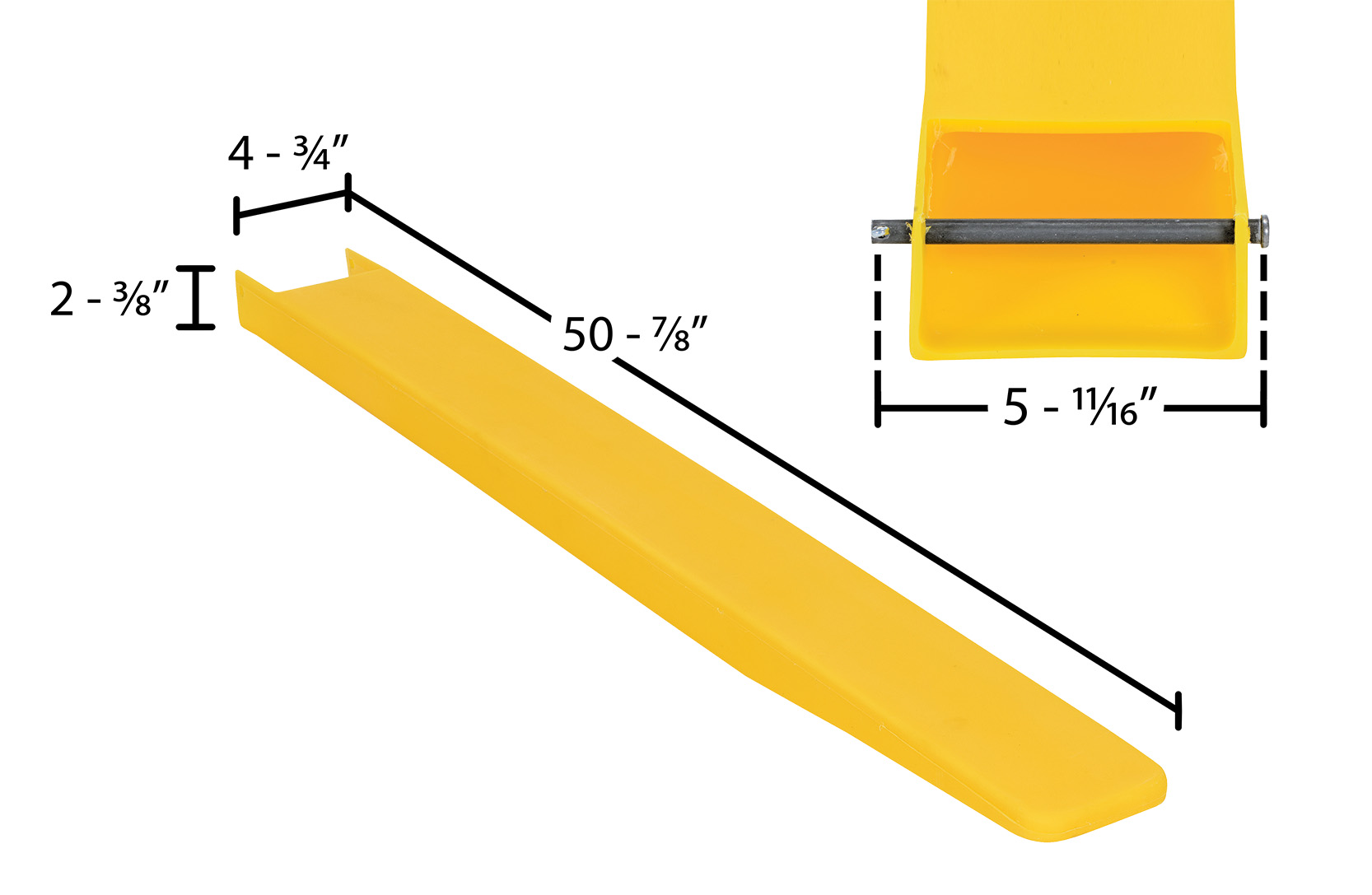 Polyethylene Fork Blade Protectors 4 In. x 48 In. YellowThe fork blade protectors are a great addition to the fork truck forks used in a variety of facilities. The unit is designed of a polyethylene construction for lightweight transference from workstation to workstation. The bright color enhances visibility for the user as well as other personnel in the work area. A simple installation onto the fork can have the protector in place and ready for immediate use.