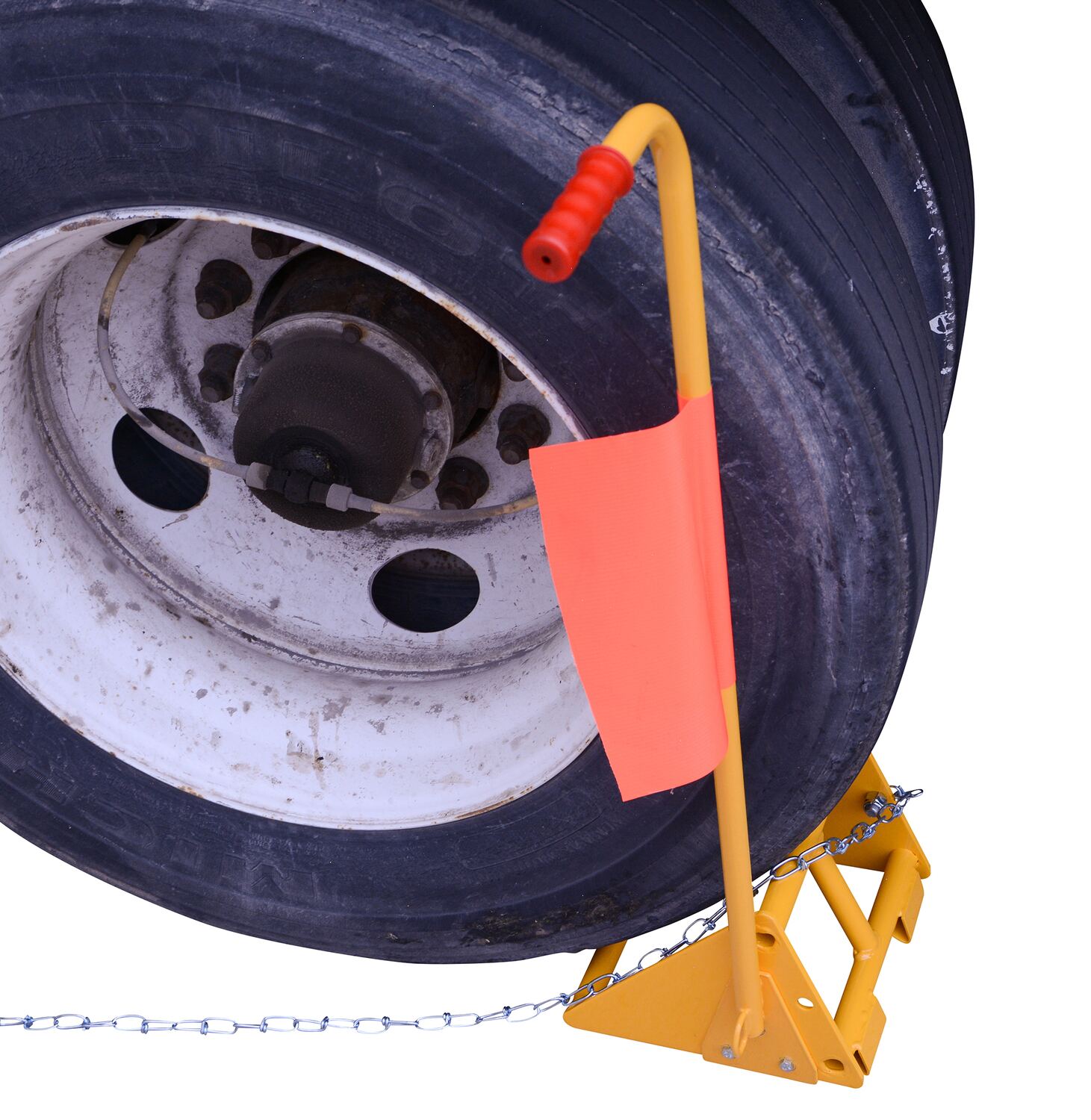Fabricated Steel Wheel Chock With Ergonomic Handle and Flag YellowThe fabricated ergo-handle Wheel Chock has an ergonomic design that makes it easy to move wheel chocks in and out of position under trailer wheels. It reduces the risk of back, knee, and foot injuries. The handle is constructed of steel and includes a yellow powder coat finish. D-ring provided for attaching security chain. A vinyl flag is included to provide added visibility and awareness to the chock. Assembly required.