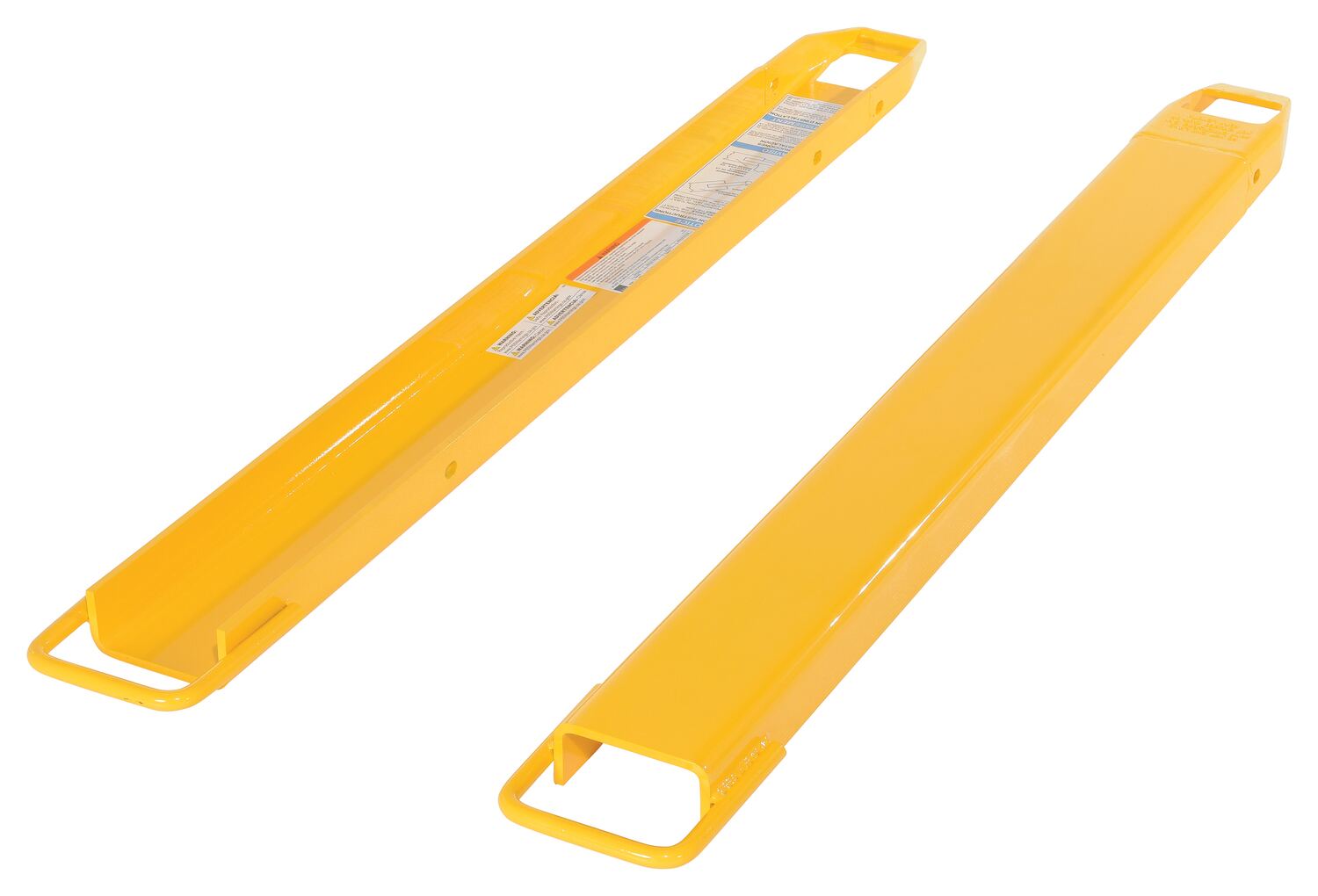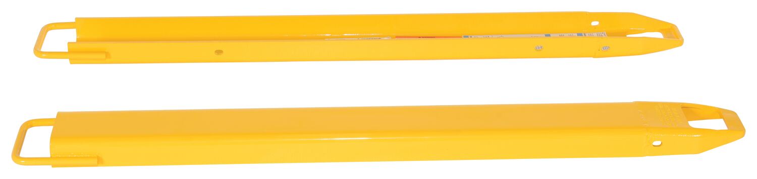 Steel Fork Extensions 4 In. x 54 In. 4000 Lb. Capacity YellowProvide the extra support needed to lift long or large objects with a fork truck using a pair of fork extensions. Welded steel construction with cast steel tips. Steel retaining strap prevents fork extensions from sliding off forks during use. Powder coat yellow finish. OSHA regulations require that extensions are no more than one-hundred and fifty (150) percent of the existing fork length. Insert loop at the tip of the fork and slide it up at a forty-five (45) degree angle. Then, lay it down over the existing fork. To be used with class 2 and class 3 forks only.