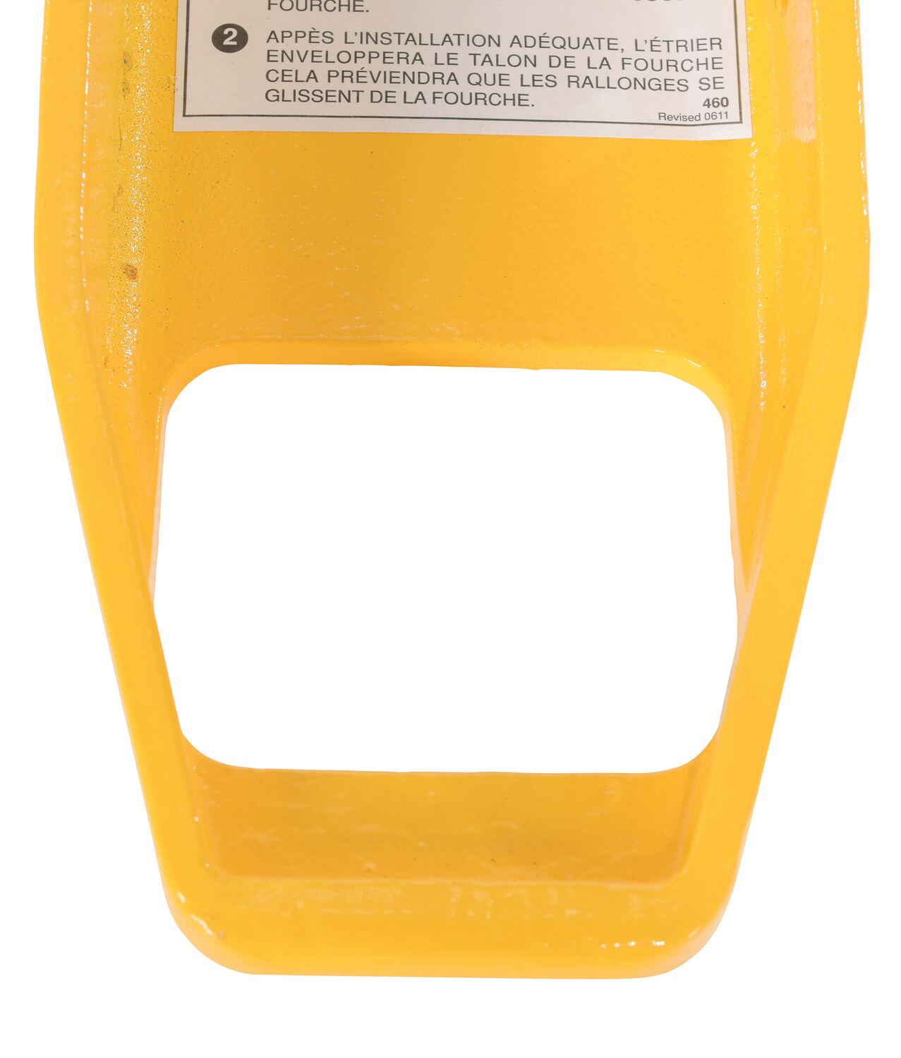Provide the extra support needed to lift long or large objects with a fork truck using a pair of fork extensions. Welded steel construction with cast steel tips. Steel retaining strap prevents fork extensions from sliding off forks during use. Powder coat yellow finish. OSHA regulations require that extensions are no more than one-hundred and fifty (150) percent of the existing fork length. Insert loop at the tip of the fork and slide it up at a forty-five (45) degree angle. Then, lay it down over the existing fork. To be used with class 2 and class 3 forks only.