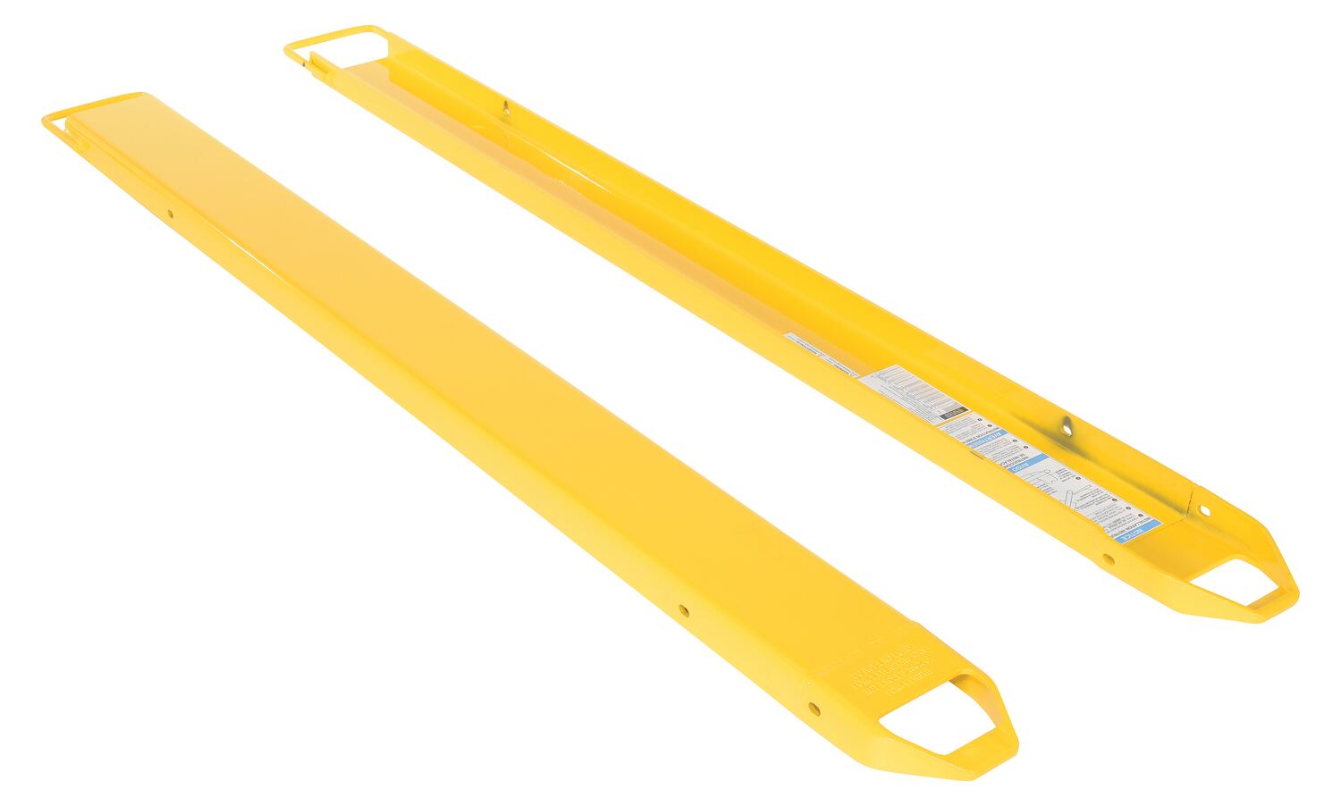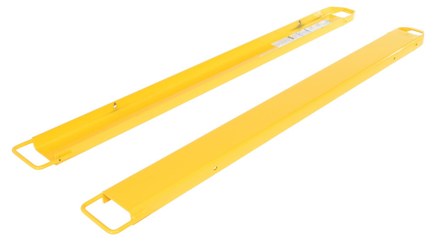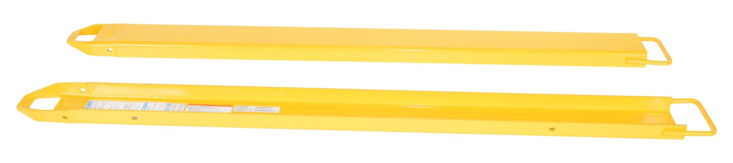 Steel Fork Extensions 6 In. x 84 In. 4,000 Lb. Capacity YellowProvide the extra support needed to lift long or large objects with a fork truck. Welded steel construction with tapered steel tips. Steel retaining strap (loop style*) prevents fork extensions from sliding off forks during use. Baked-in powder coat finish for added toughness. OSHA regulations require that extensions are no more than 150% of the existing fork length. (e.g. 48" existing forks, the fork extension should not exceed 72"). Maximum uniform capacity is 4,000 pounds evenly distributed per pair. To be used with class 2 and class 3 forks only.