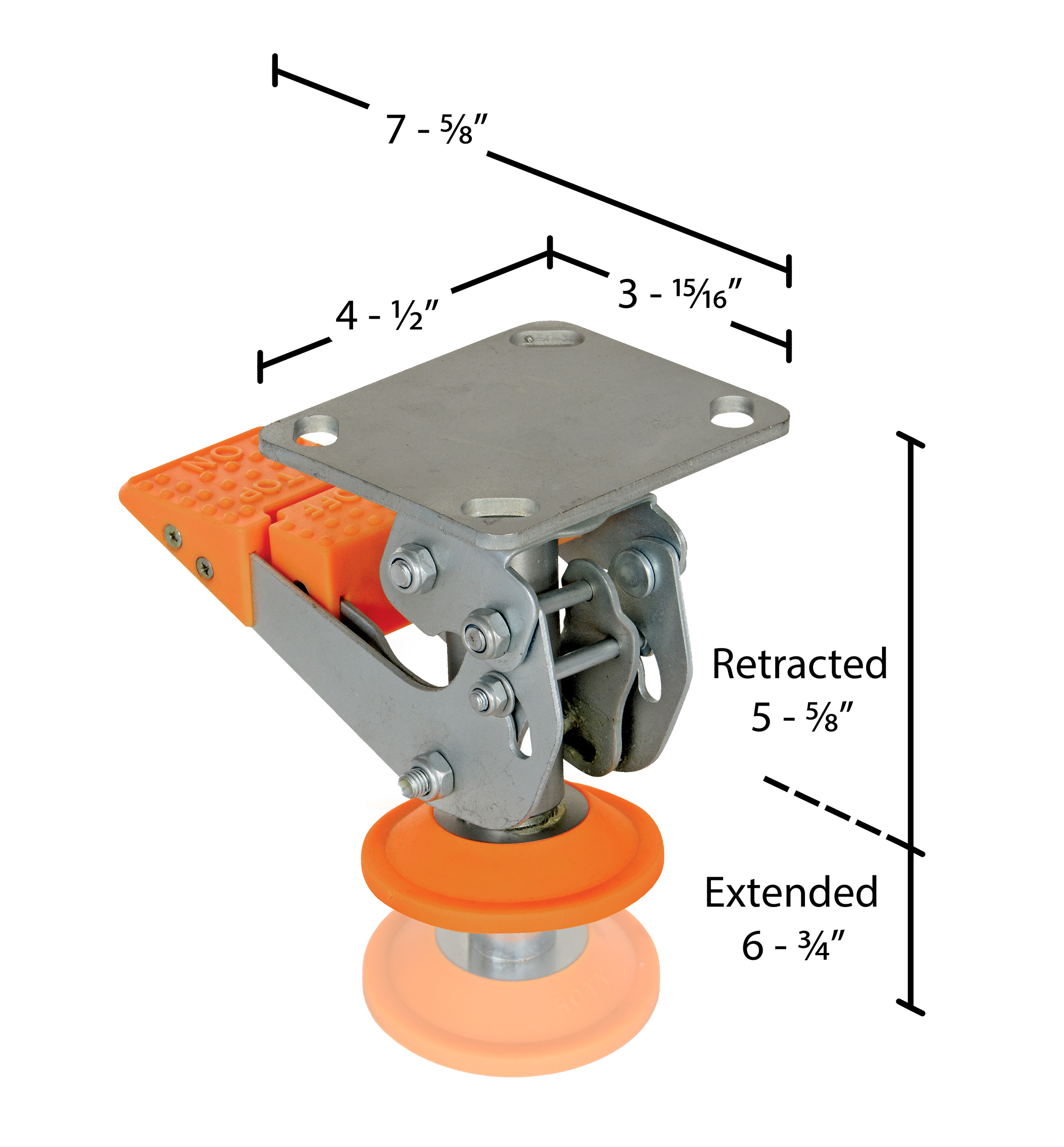 | Lowered Height (in.): 5-5/8 | Raised Height (in.): 6-3/4 | Foot Pad Diameter (in.): 3-5/16 |