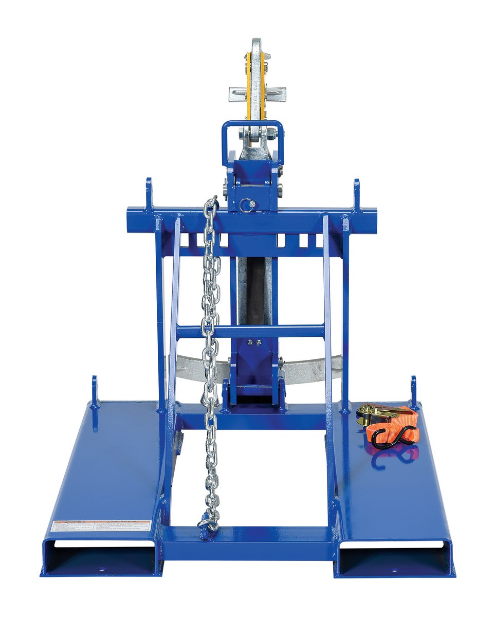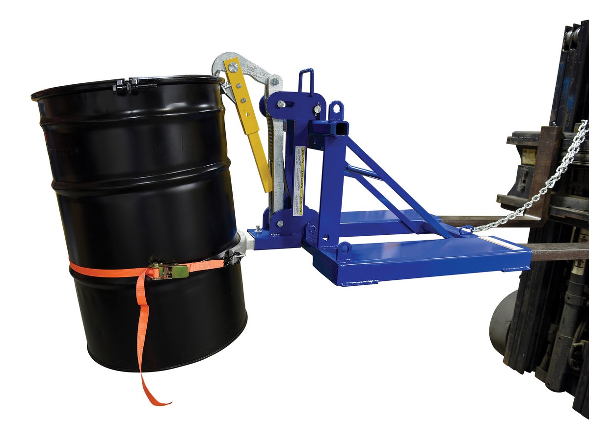 This time tested and proven automatic eagle beak Drum Lifter design allows a fork truck operator to easily secure, move, and release drums without leaving the seat of the fork truck. For use with open (lid installed and secured) and closed head steel, plastic and fiber drums with a top lip strong enough to support the weight of the drum. This unit is a single-drum configuration. Includes safety restraint to secure unit to the fork truck. A ratchet strap is supplied to secure the drum to the unit when traveling over rough terrain. Complies with OSHA 1910.178; ANSI B56.1.