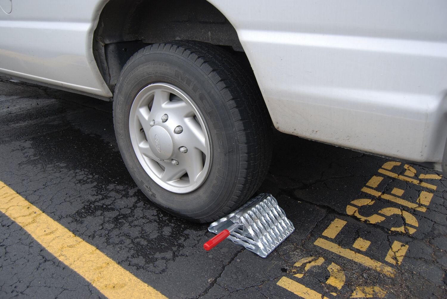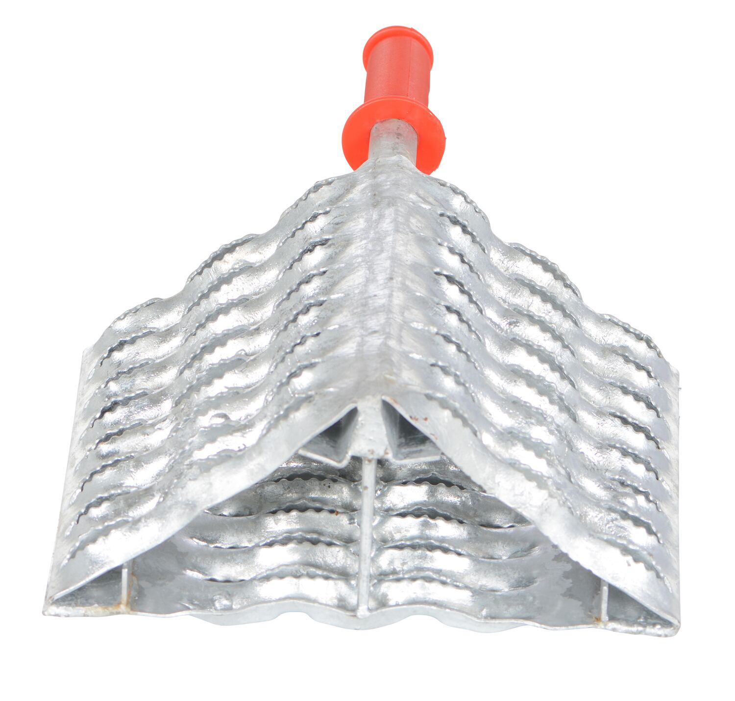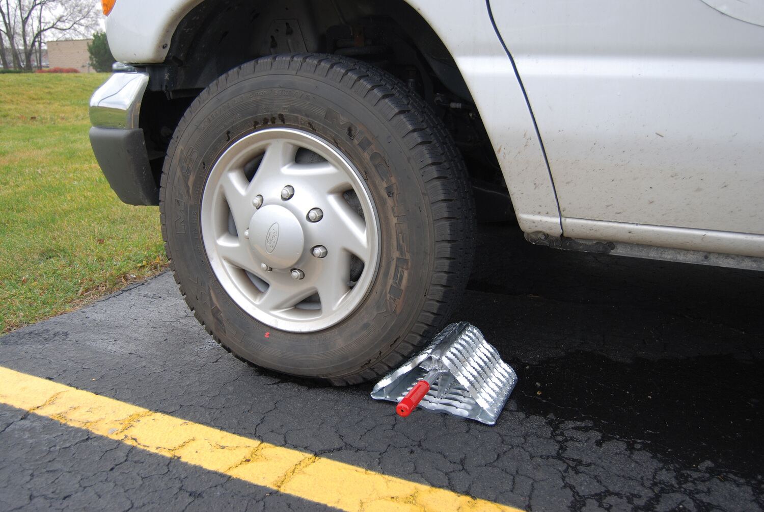 The steel Wheel Chock is made of serrated steel in a grate style. It has a galvanized finish and includes a positioning handle with grip.