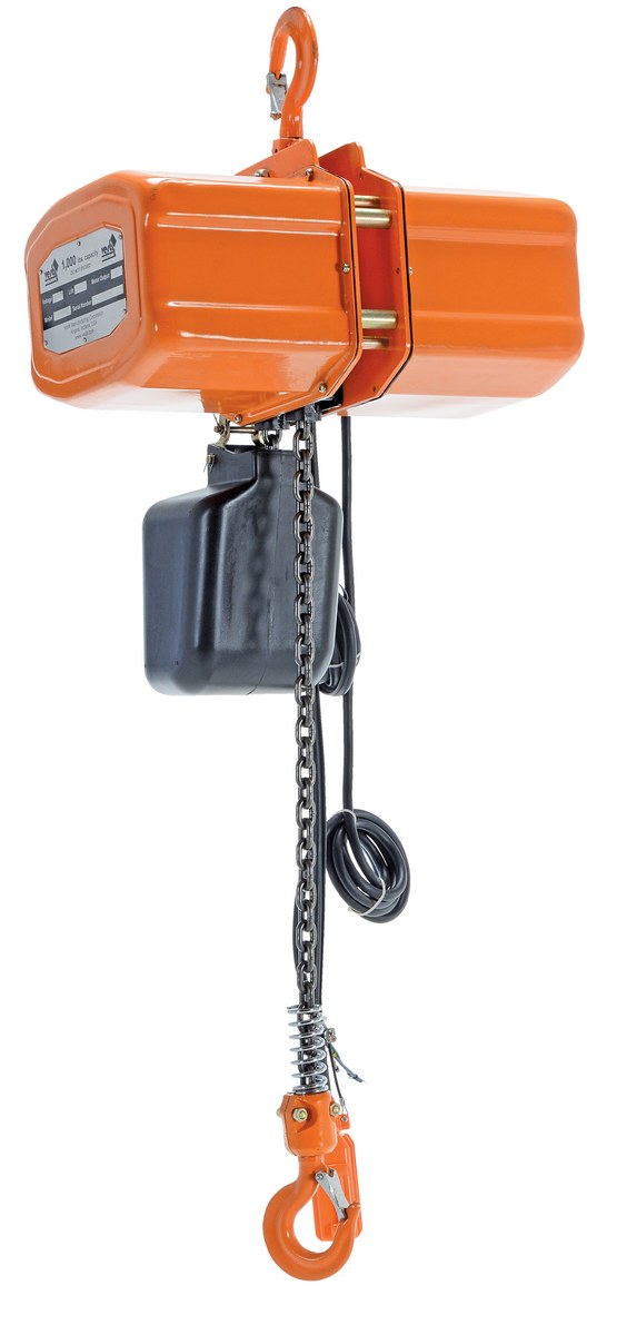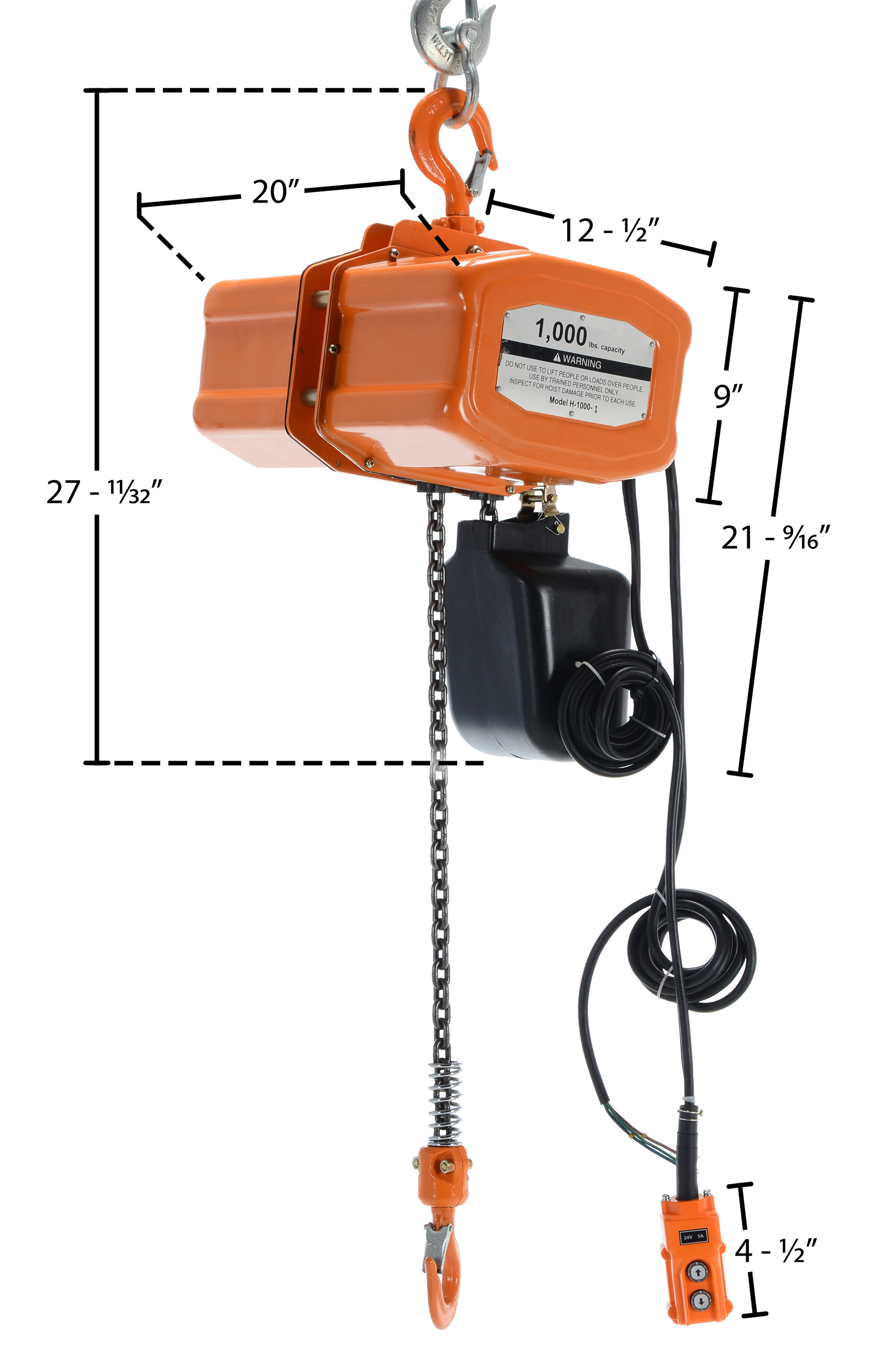Steel Economy Chain Hoist with Chain Container 1 Phase 1000 Lb. Capacity OrangeThis compact economy Chain Hoist with chain container features a high efficiency motor with convenient push-button operation and single phase power. This hoist is dust and water resistant, load limit fitted, and features a 4:1 safety factor. Chain container included.