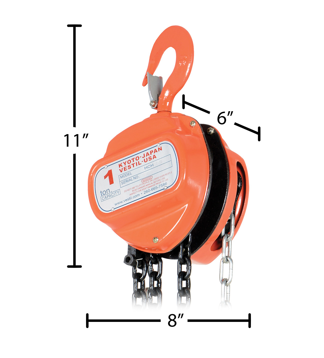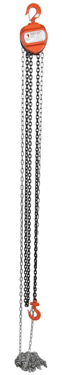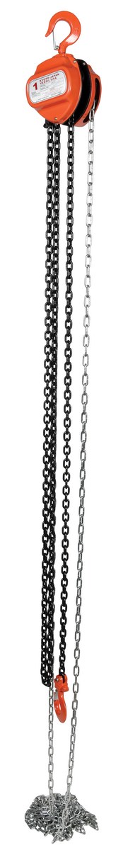 Steel Manual Chain Hoist 15 Ft. Lift 2,000 Lb. Capacity OrangeThis portable, lightweight hand Chain Hoist is durable and easy to operate. Compact design and low headroom allow installation in confined areas. Enclosed double ratchet pawls with self adjusting disc brake standard. Designed with a safety factory four (4) times rated capacity. Individually tested at 150% rated capacity. Features black chain tempered to ISO 3077, pull chain, hardened two-stage gears and forged steel upper and lower hooks with safety latches. Constructed of high quality steel components ideal for industrial applications.