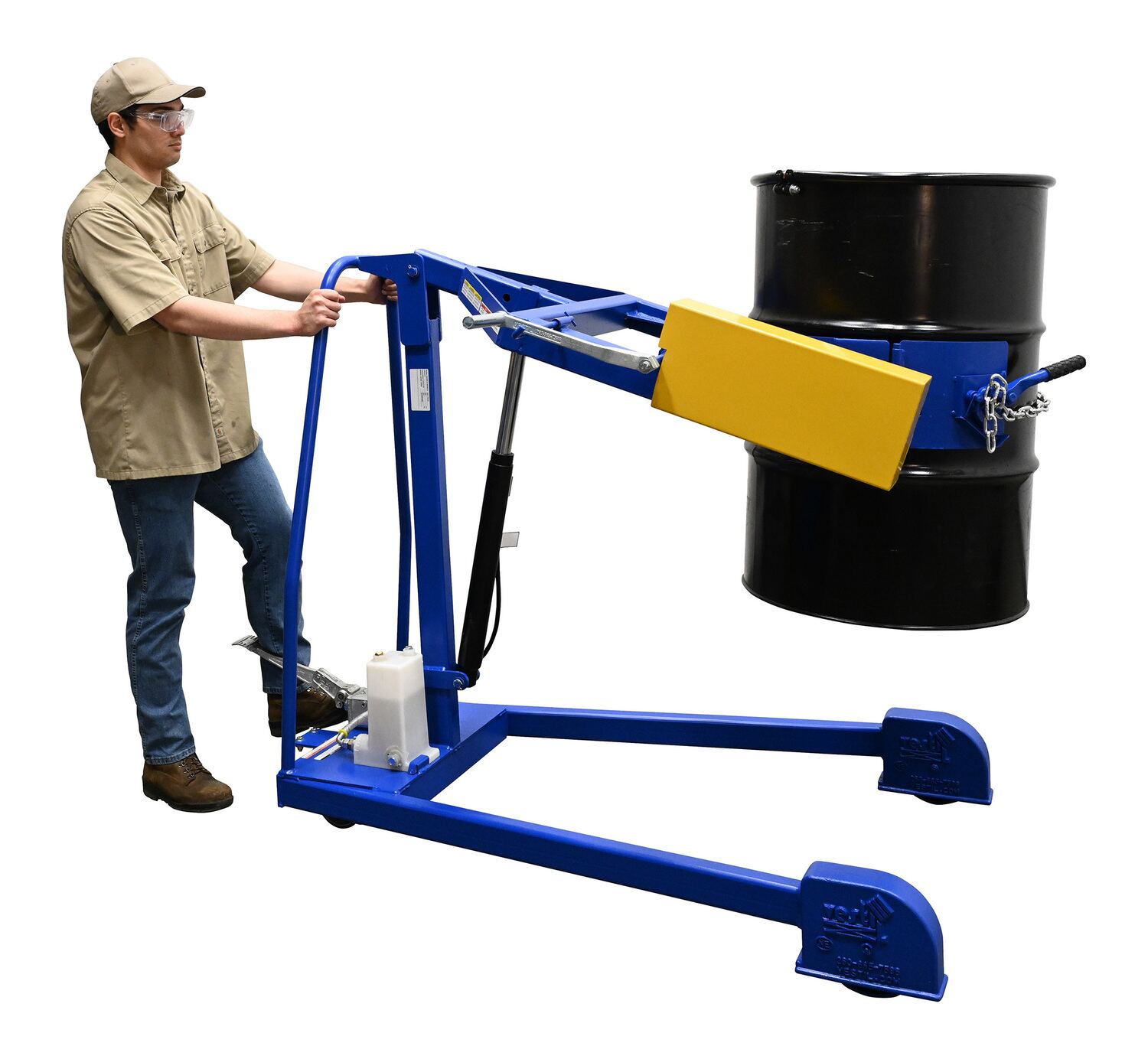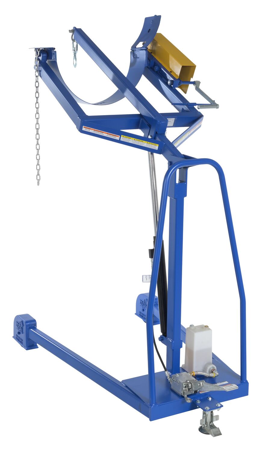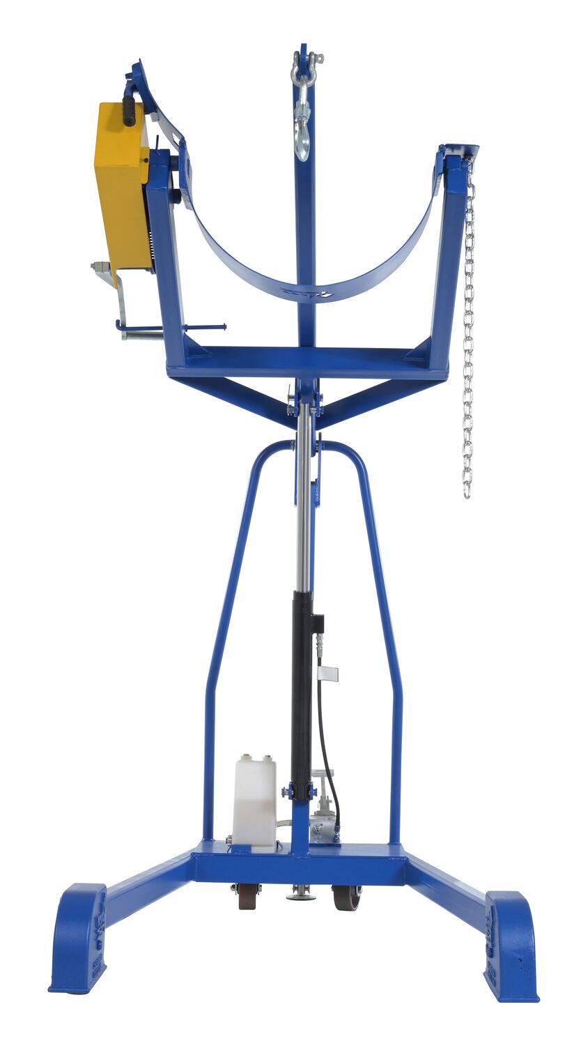 Steel Portable Hydraulic Drum Carrier, Rotator and Boom 71-1/4 In. Lift Height 800 Lb. Capacity Blue / YellowThe portable Hydraulic drum carrier/rotator/boom allows one person to lift, transport, and dispense fully loaded steel drums with ease. It features a manual foot pump hydraulic lift and rolls on casters and wheels. This unit has a chain rotation to rotate the drum. This unit features a lifting boom attachment which stores on the outriggers.