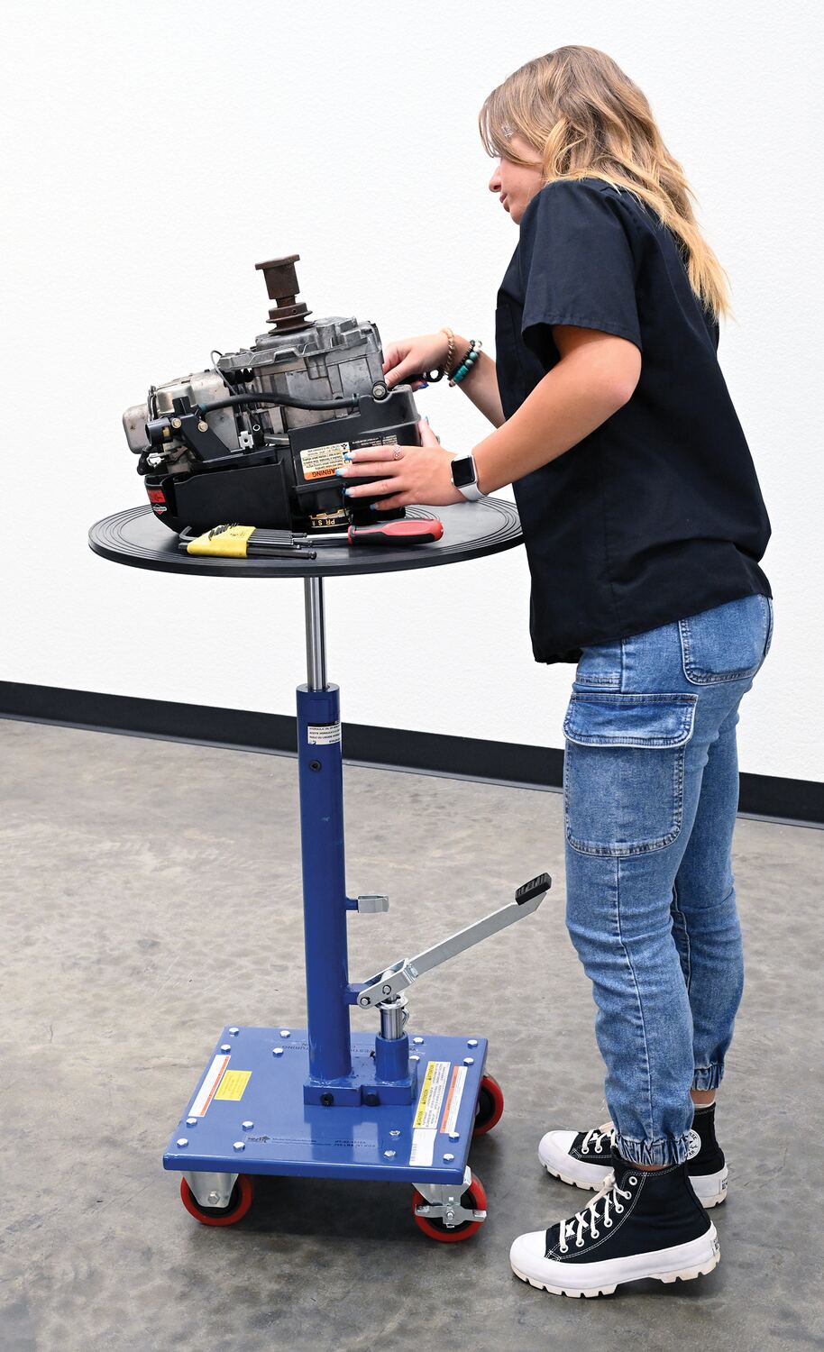 Steel 24" Round Top Hydraulic Post Table 200 Lb. Capacity BlueA hydraulic post table works well in a variety of environments from lifting dies and castings to moving machine parts. The adjustable height allows the user to match their preferences with the table top. The table rolls on two swivel and two rigid casters. Brakes are included on the casters to help maintain stability during the loading and unloading process. Post table is built of steel with a powder coated finish.