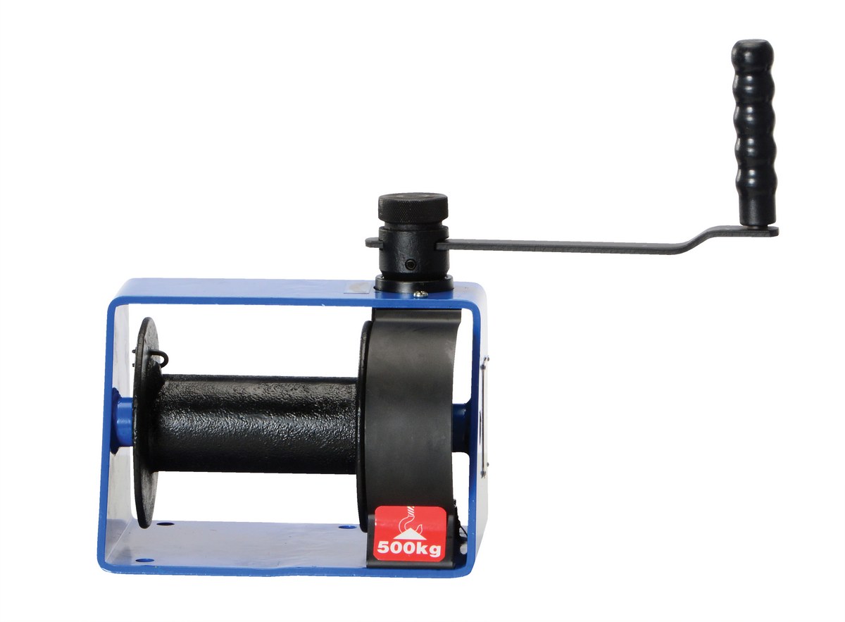 Steel Hand Winch Vertical Handle Worm Gear 1000 Lb. Capacity BlueThis worm gear - winch allows for better load control and features a reinforced frame, comfort-grip handle. Worm gear provides load holding capability when handle is released. Reel stops automatically, locking load in place whenever the handle is released. High quality enamel paint finish, dipped and baked. Crank handle can be adjusted in length. Winch housing and rope drum are made from robust steel plate.