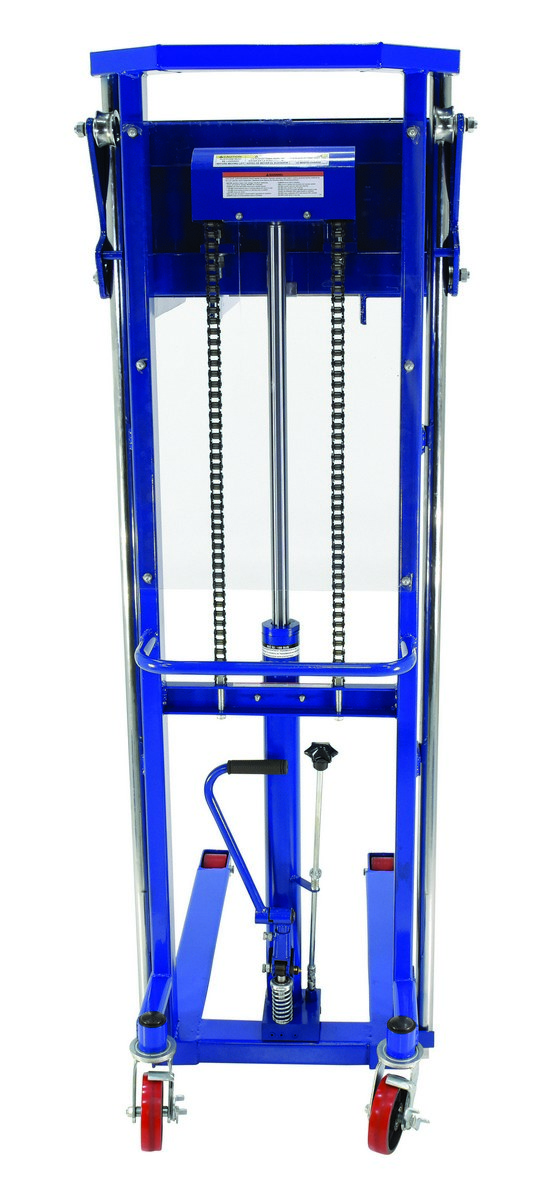 Steel Portable Foot Pump Hefti-Lift 51 In. x 79-3/8 In. 1500 Lb. Capacity BlueThe Hefti-Lift is a user friendly, portable hydraulic lift. The lift provides reliable, power lifting when moving and positioning loads. The non-slip chain is used for accurate positioning while the unit rolls easily on two rigid and two swivel poly-on-steel casters that includes a foot operated brake. The lift is all welded construction with a chrome platform and uprights. Not for use with pallets.