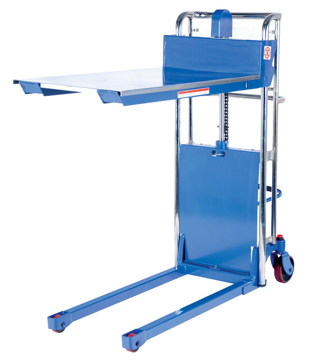 Steel Portable Foot Pump Hefti-Lift 60 In. x 54 In. 400 Lb. Capacity BlueThe Hefti-Lift is a user friendly, portable hydraulic lift. The lift provides reliable, power lifting when moving and positioning loads. It includes a removable platform for operation requiring forks. The non-slip chain is used for accurate positioning while the lift rolls easily on two rigid and two swivel poly-on-steel casters that includes a foot operated brake. The lift is all welded construction with a chrome platform and uprights. Not for use with pallets.