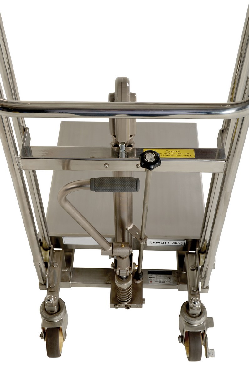 Stainless Steel Hydraulic Hefti-Lift 35-13/16 In. x 52-1/8 In. 450 Lb. Capacity SilverThe Hefti-Lift Stainless Steel units are compact, lightweight, and capable of turning in a small radius when space is limited. A built-in automatic load check valve is included for improved safety. Units provide reliable powerful lifting when moving and positioning loads. The manual hydraulic foot pump yields. The units roll smoothly on two rigid and two swivel poly-on-steel casters with foot operated brake. Each\ fork is 4."W x 2."H, the fork length is the same as the platform length. Overall fork width is 22". Not for use with pallets.