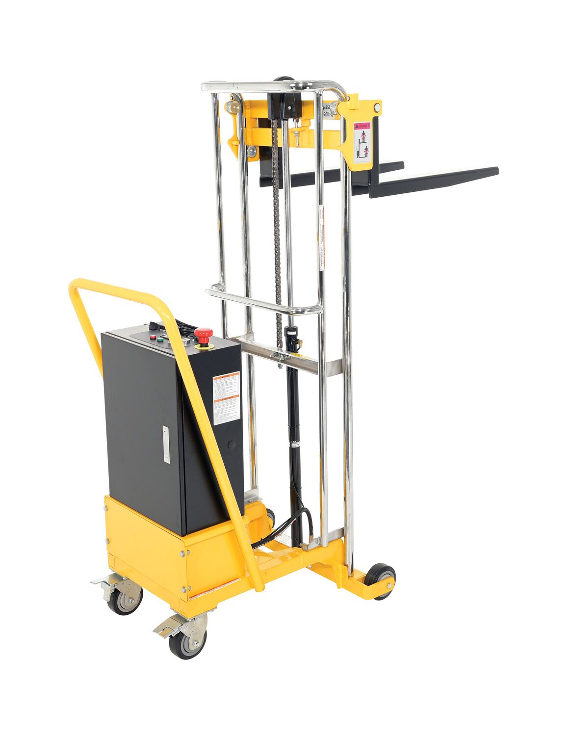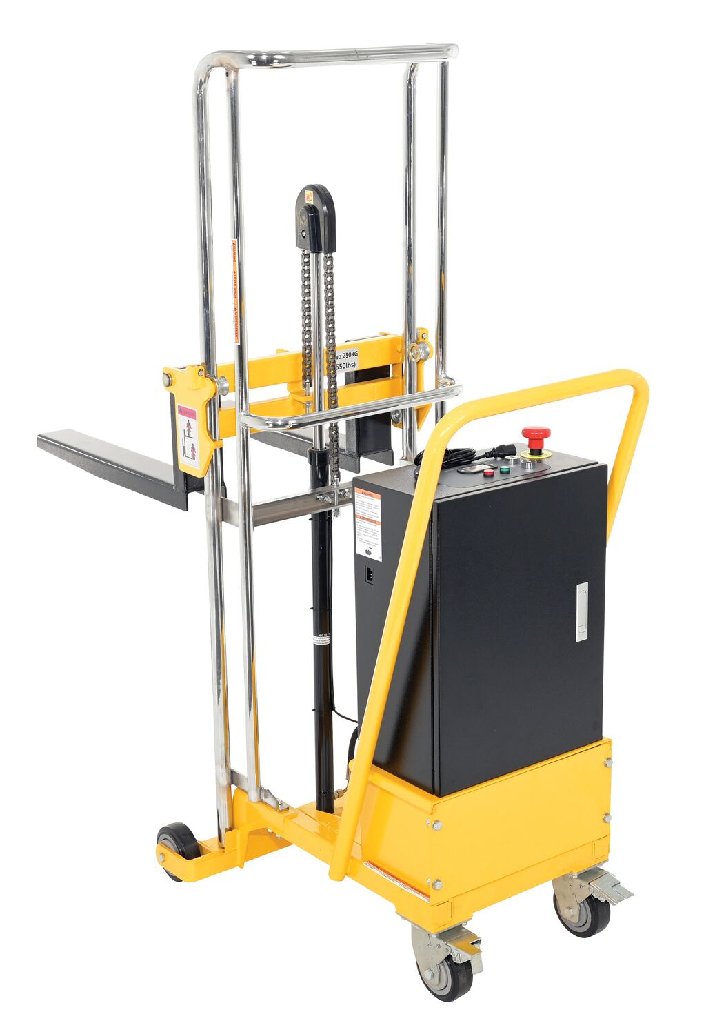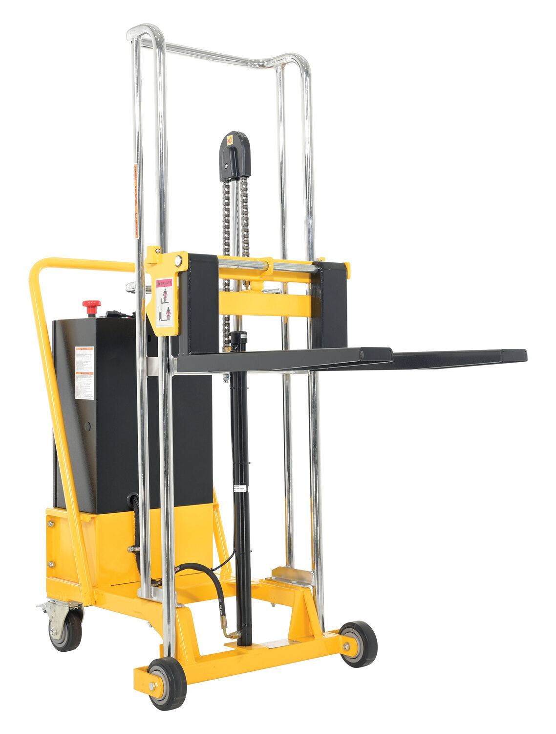 Steel Counter Balanced Hefti-Lift 68 In. x 68-3/4 In. 550 Lb. Capacity Yellow / BlackDC powered portable hydraulic lifts are user friendly providing reliable, powerful lifting when moving and positioning loads. Units roll easily on two rigid and two swivel poly-on-steel casters and include a foot operated brake. Not for use with pallets. All welded steel construction with chrome uprights. Variety of attachments available.