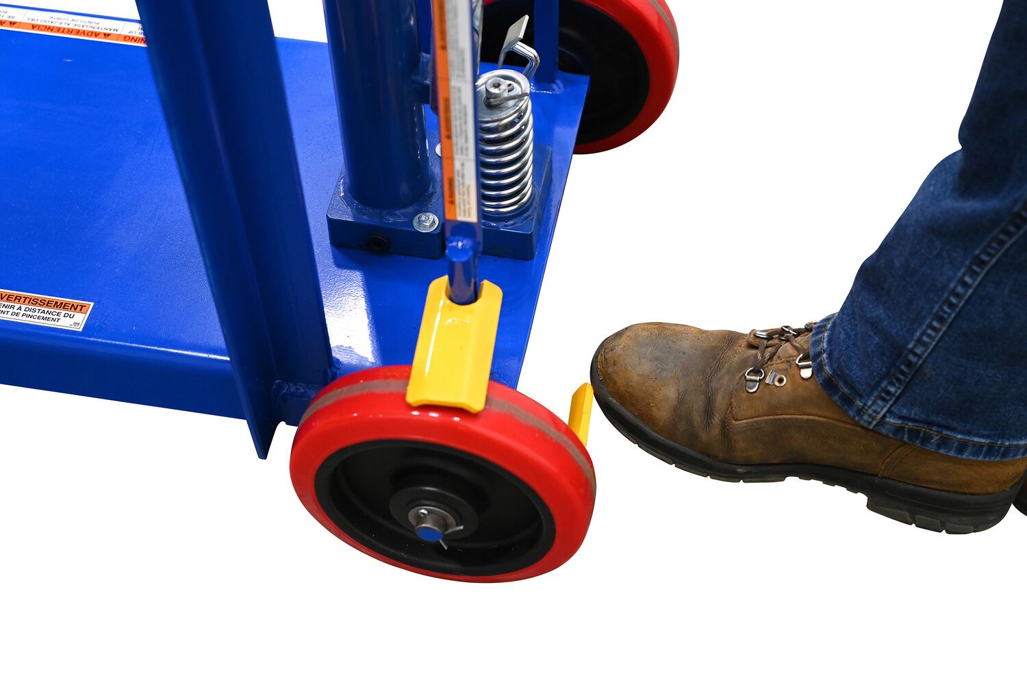 Steel Hydra Lift Cart 33-3/4 In. x 20-1/2 In. 750 Lb. Capacity BlueThe hydra cart transports loads in the lowered position and maneuver work materials to an ergonomic height, which is ideal in compact work areas. It's safe and easy for one person handling of loads and an efficient way to unload heavy objects from semi-trailers. The rugged steel construction allows for many years of service. The dependable precision built hydraulic system is activated by an easy action foot lever. The additional rollers on the handle make loading into a delivery truck easy. A single wheel brake comes standard.