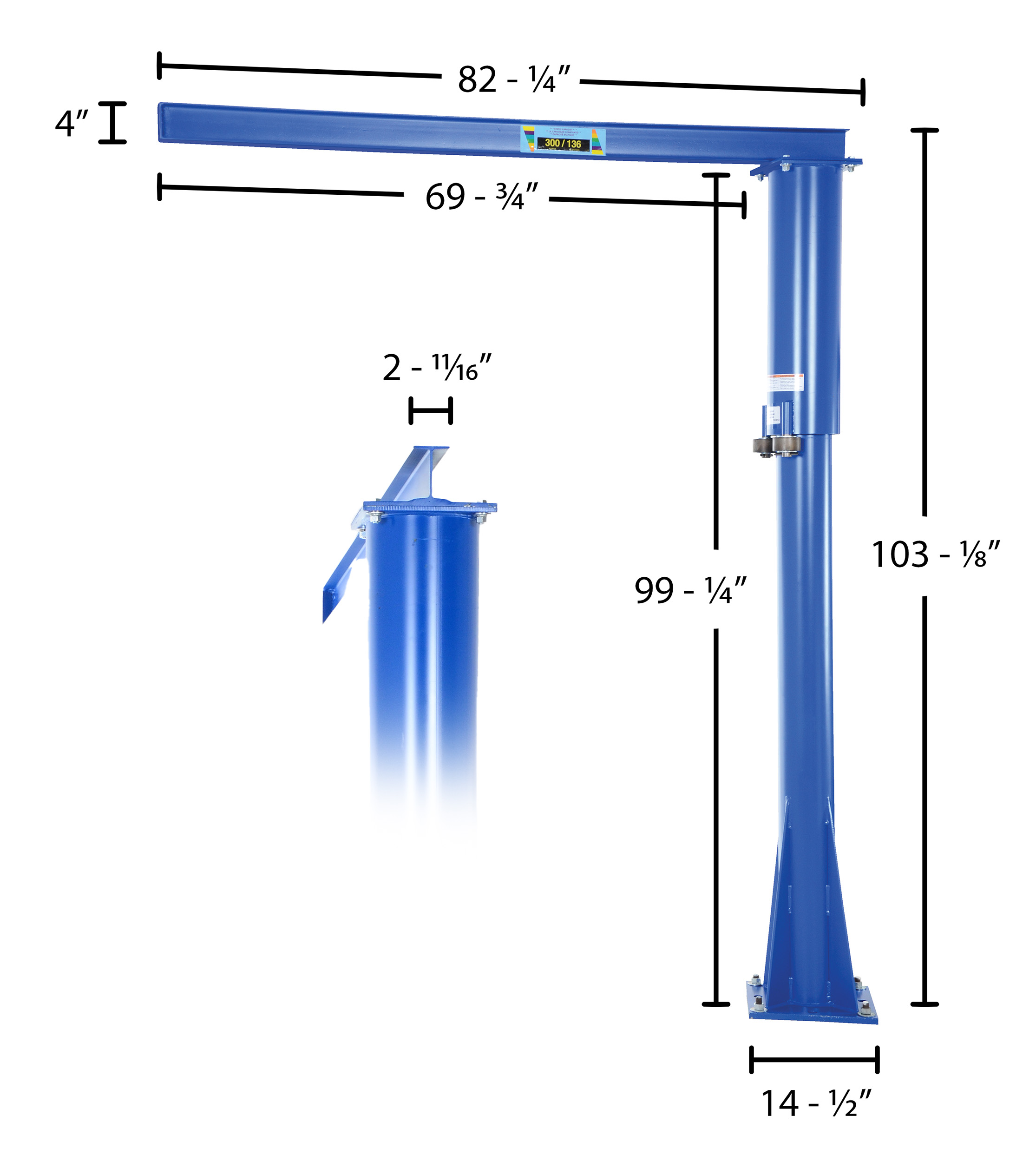 Steel Floor Mounted Jib 80 In. I-Beam 300 Lb. Capacity BlueThis floor mounted jib adapts well to a variety of applications. With the unique design, the jib is functional in any direction for complete customization of the work station. Solid steel construction will assist workers in lifting awkward material. Hoists & Trollies can be ordered separately.