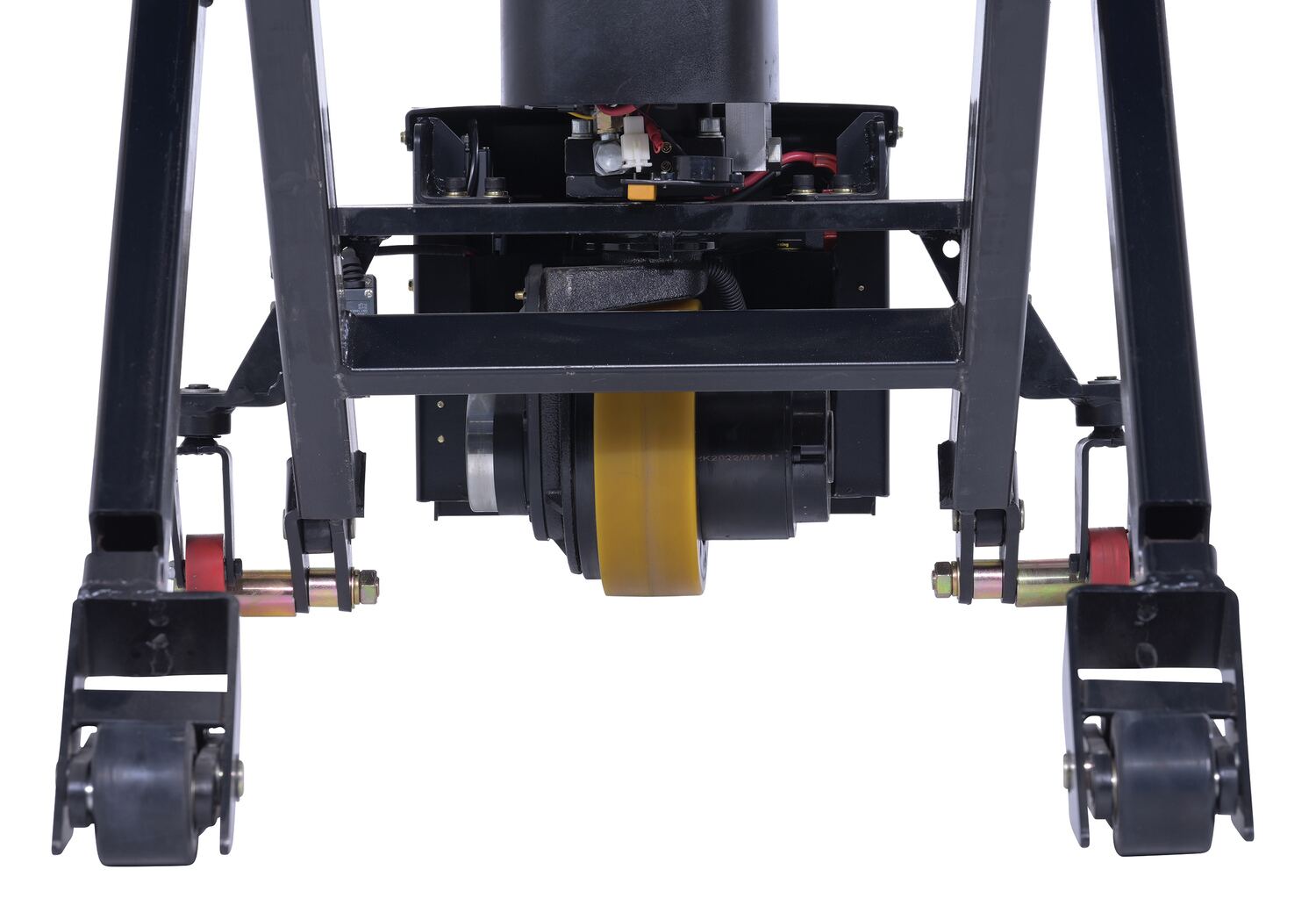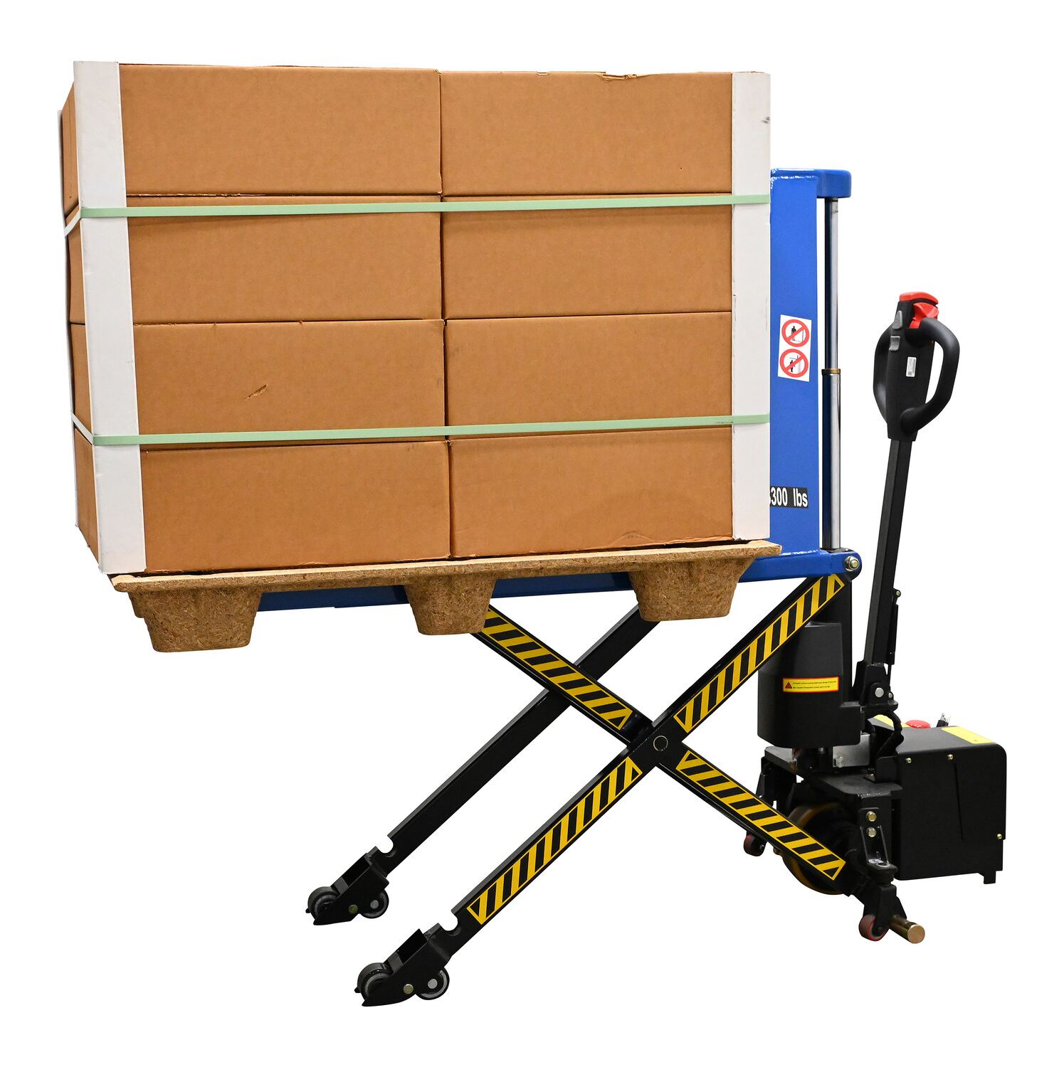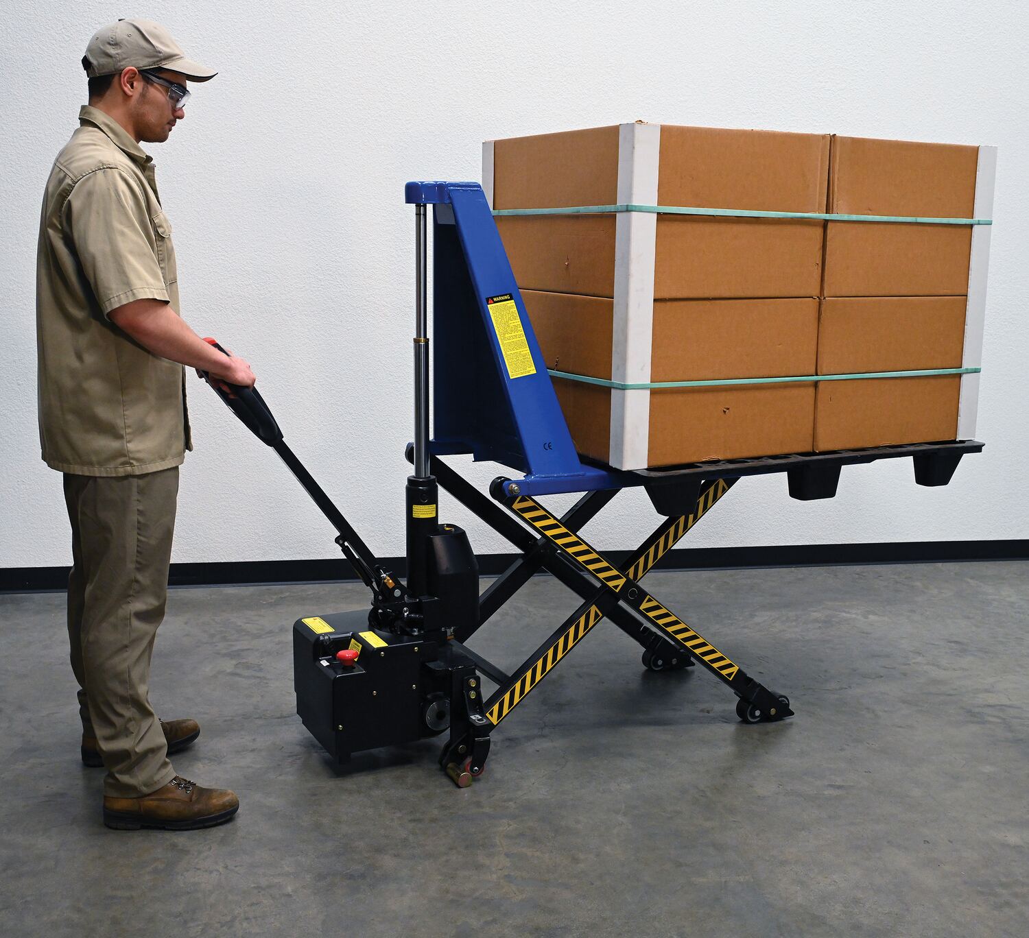 Steel DC Powered Tote Lift 27x45 Traction Drive 3000 Lb. Capacity BlueThis tote lifter is specifically designed to raise open bottom skids, boxes, and baskets. With an ergonomic handle and adjustable speeds, light and heavy loads are easily accommodated. Built-in controls are located on the steering handle and are effortlessly accessible. The open sided design allows for a safe loading and unloading process.