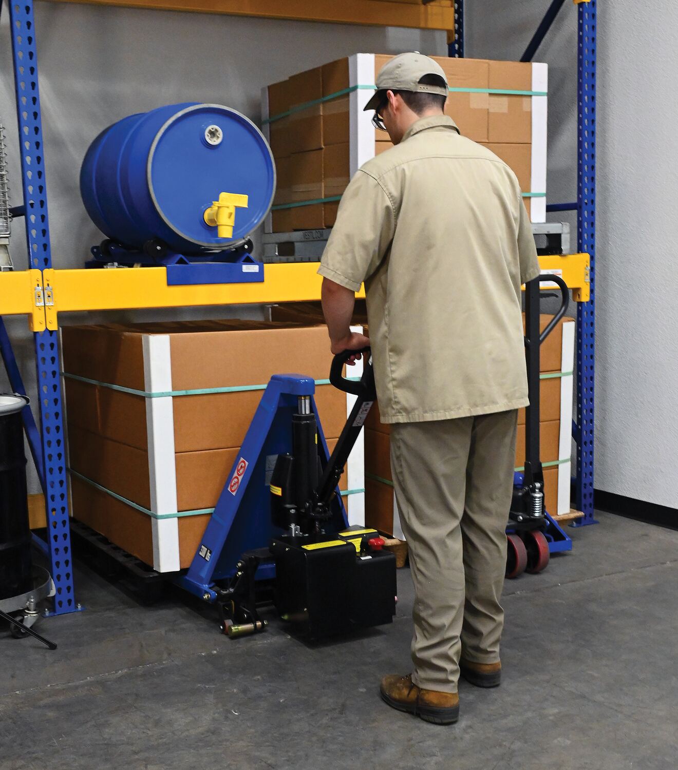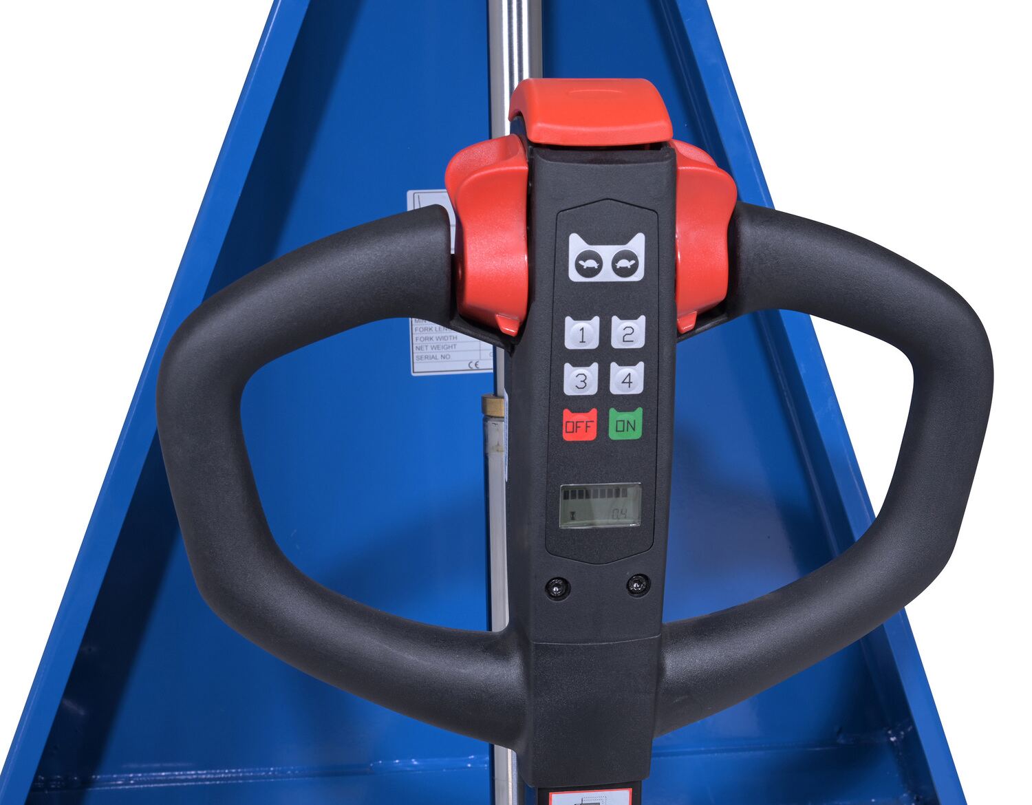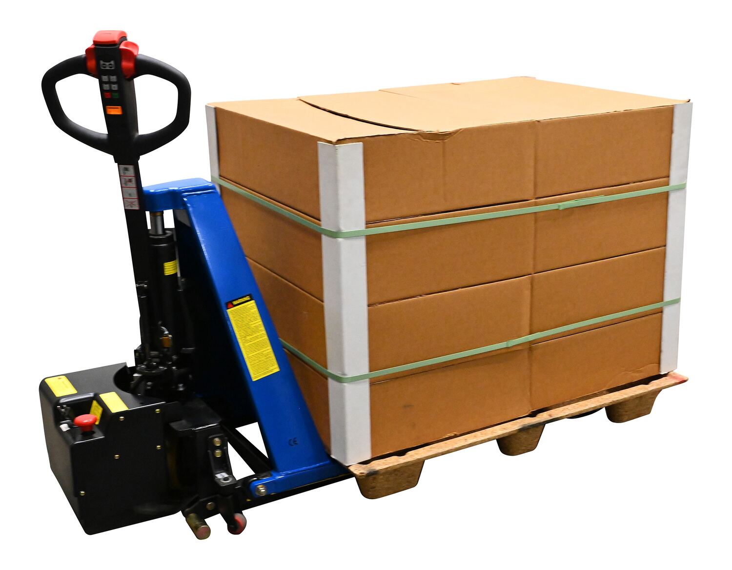 Steel DC Powered Tote Lift 27x45 Traction Drive 3000 Lb. Capacity BlueThis tote lifter is specifically designed to raise open bottom skids, boxes, and baskets. With an ergonomic handle and adjustable speeds, light and heavy loads are easily accommodated. Built-in controls are located on the steering handle and are effortlessly accessible. The open sided design allows for a safe loading and unloading process.