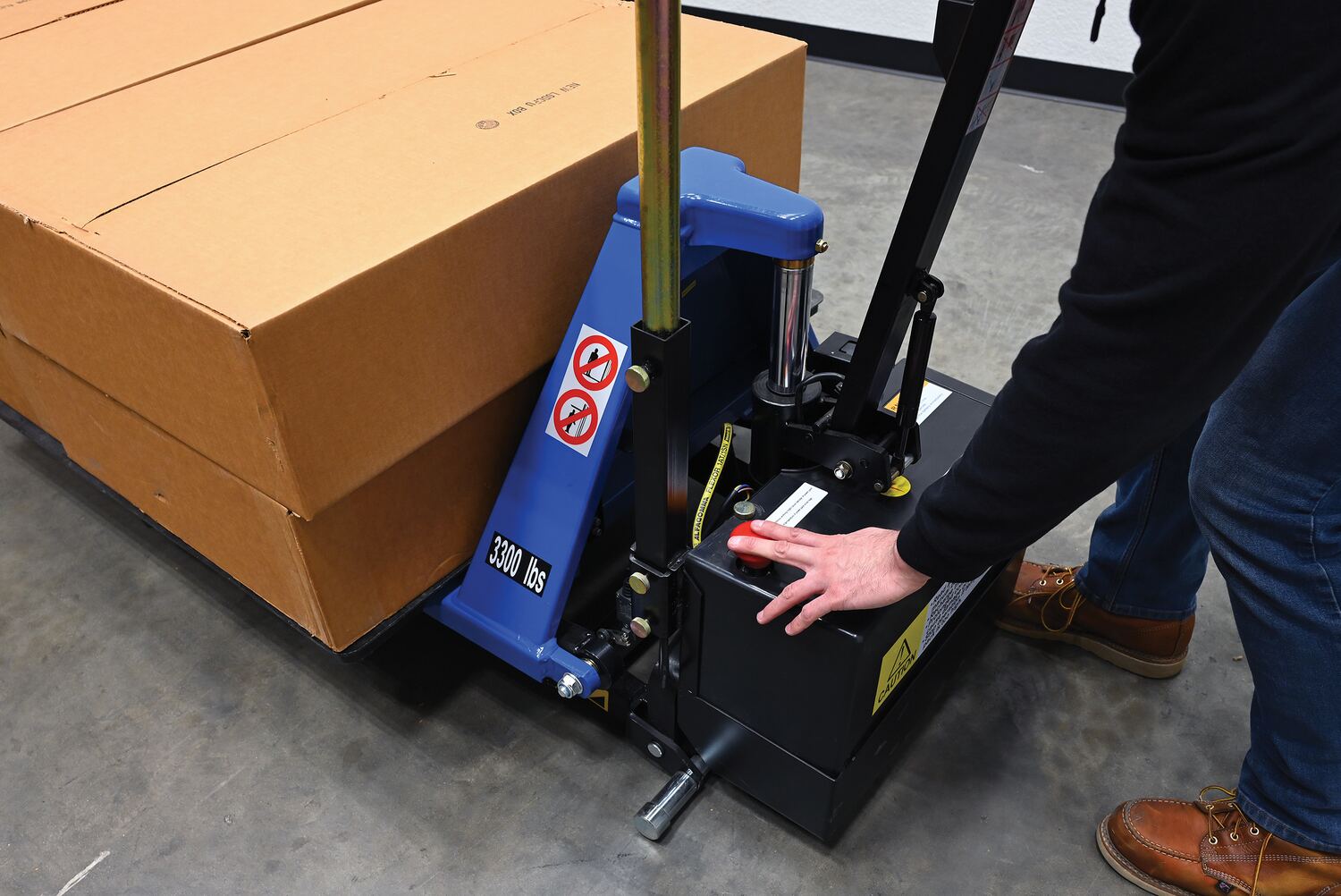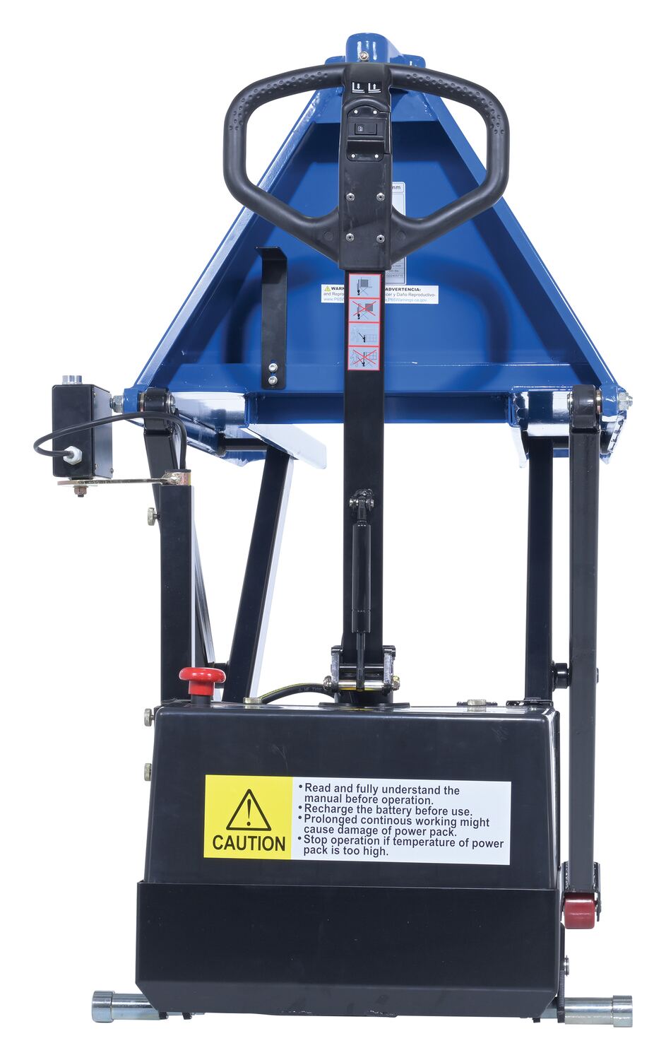 Steel DC Powered Tote Lift Photo Eye 62-1/4 In. x 29 In. x 51-1/4 In. 3000 Lb. Capacity BlueWhether your load is light, small, heavy, or large this tote lifter can manage the job! With its specifically designed structure, it is perfect for lifting open bottom skids, boxes, and baskets. Through a DC power supply, a simple rocker switch is used for raising and lowering. Not only that; but used in conjunction with the attached photo eye sensor, adjusting load heights has seldom been easier or more accurate. The photo eye sensor provides a visual representation of the tote lifters height while in the raising, lowering, or stationary process. An on-board battery charger is included to provide consistent power throughout the working day.