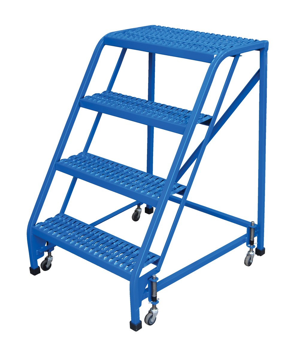 Steel Standard Slope Ladder 58 Degree 4 Grip No Handrail Step 350 Lb. Capacity BlueThe standard slope ladder is a portable warehouse ladder for every-day use applications. Grip strut steps, no handrail and welded square tubular steel construction with powder-coat blue finish. Rubber feet provided for floor protection. Unit has (2) two all directional spring-loaded swivel casters and (2) swivel casters with total locks. Ships fully assembled and ready to use.