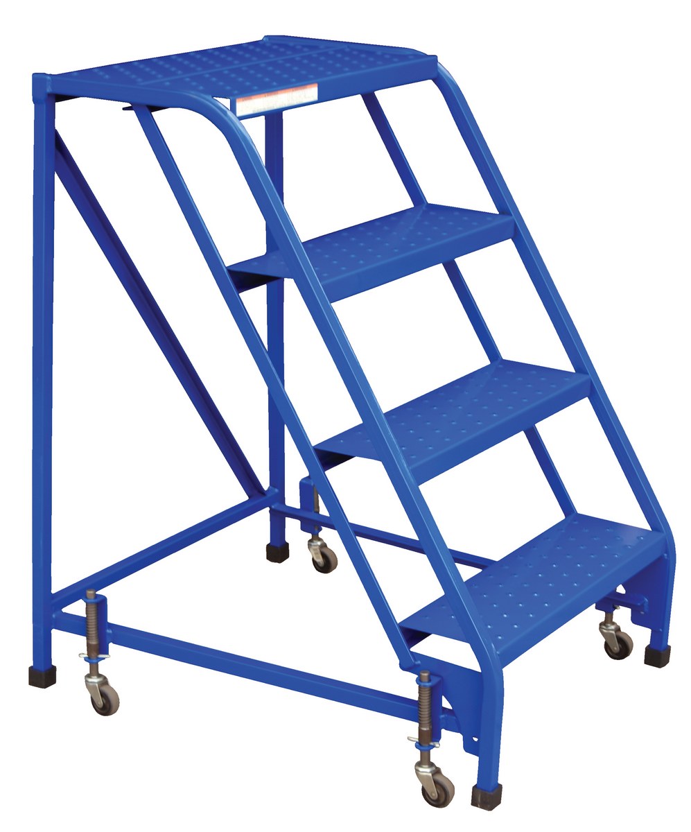 Steel Standard Slope Ladder 58 Degree 4 Perforated No Handrail Step 350 Lb. Capacity BlueThe standard slope ladder is a portable warehouse ladder for every-day use applications. Grip strut steps, no handrail and welded square tubular steel construction with powder-coat blue finish. Rubber feet provided for floor protection. Unit has (2) two all directional spring-loaded swivel casters and (2) swivel casters with total locks. Ships fully assembled and ready to use.