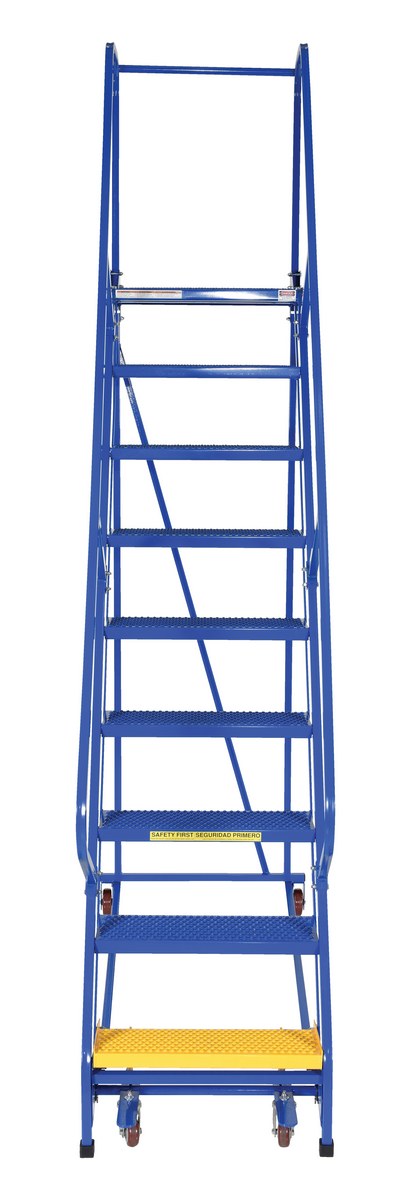 The standard slope ladder is a portable warehouse ladder for every-day use applications. Perforated steps, handrail included, welded square tubular steel construction with powder-coat blue finish. Rubber feet provided for floor protection. Unit has bottom step lock casters for safe use when climbing.