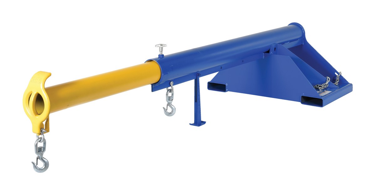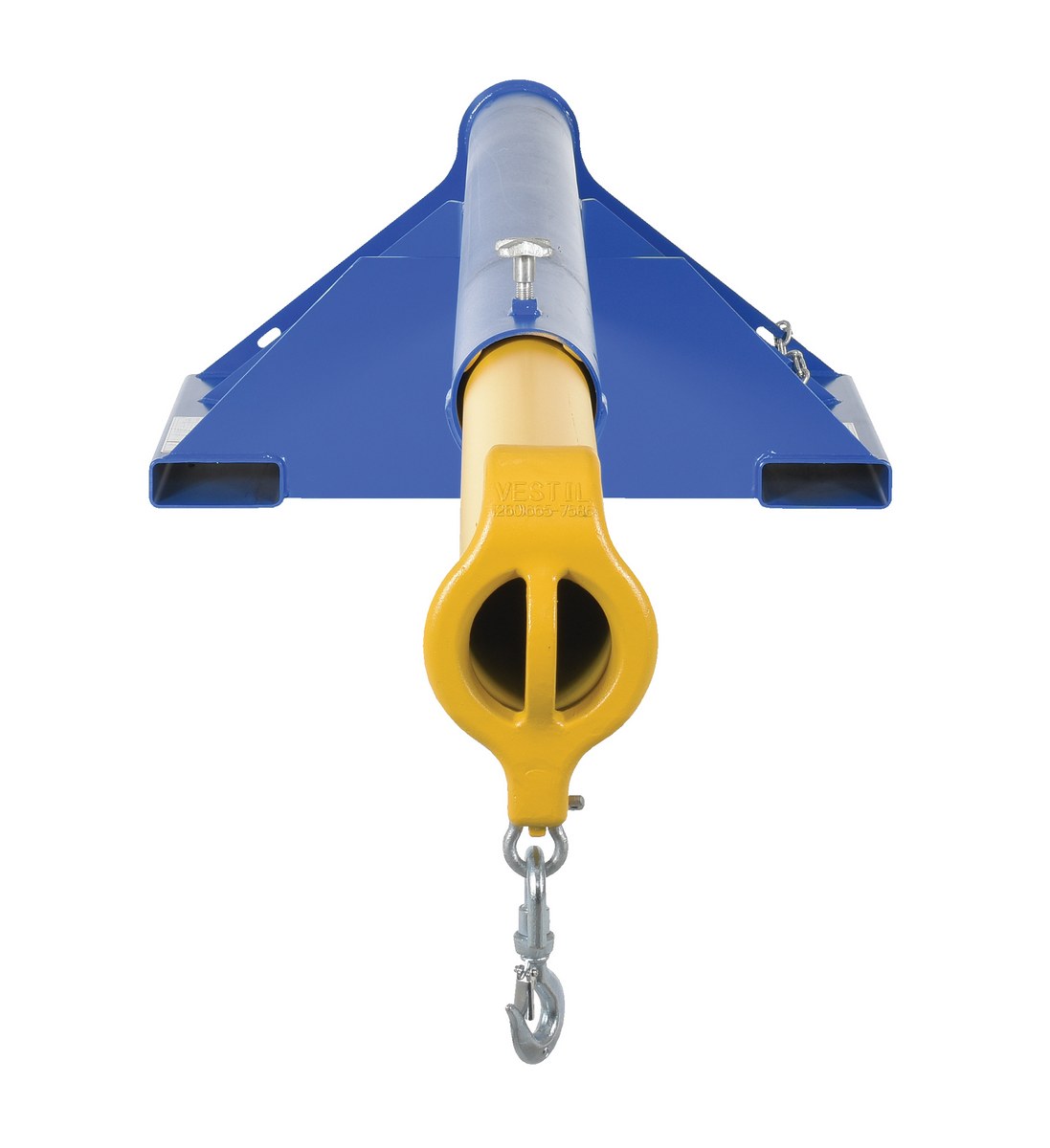 Steel Telescoping Lift Boom 36 In. Fork Pocket Center 4,000 Lb. Capacity Blue and YellowUnique performance, convenience, and safety features are built into every lift master boom. Fabricated from structural steel with welding to meet AWS creates a rugged and durable boom that will provide long term service. This unit come with an infinitely adjustable locking screw. A safety restraint secures the boom to the fork truck for safe operation. Includes two (2) lifting hooks.