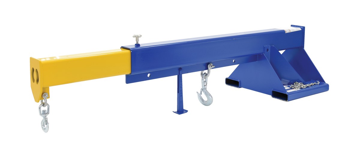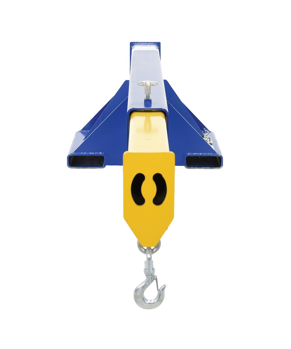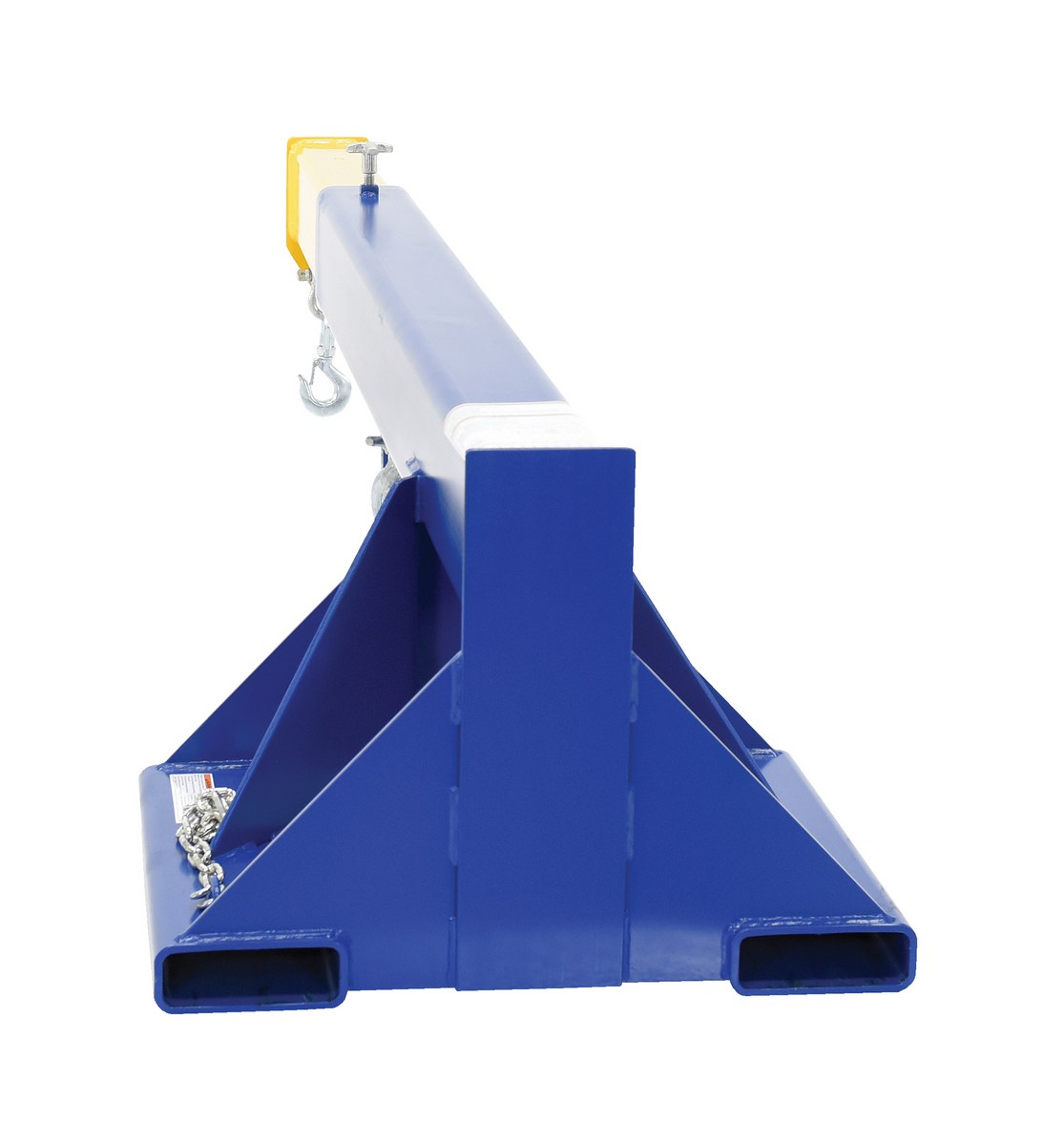 Steel Telescoping Lift Boom 24 In. Fork Pocket Center 8,000 Lb. Capacity Blue and YellowUnique performance, convenience, and safety features are built into every lift master boom. Fabricated from structural steel with welding to meet AWS creates a rugged and durable boom that will provide long term service. This unit come with an infinitely adjustable locking screw. A safety restraint secures the boom to the fork truck for safe operation. Includes two (2) lifting hooks.