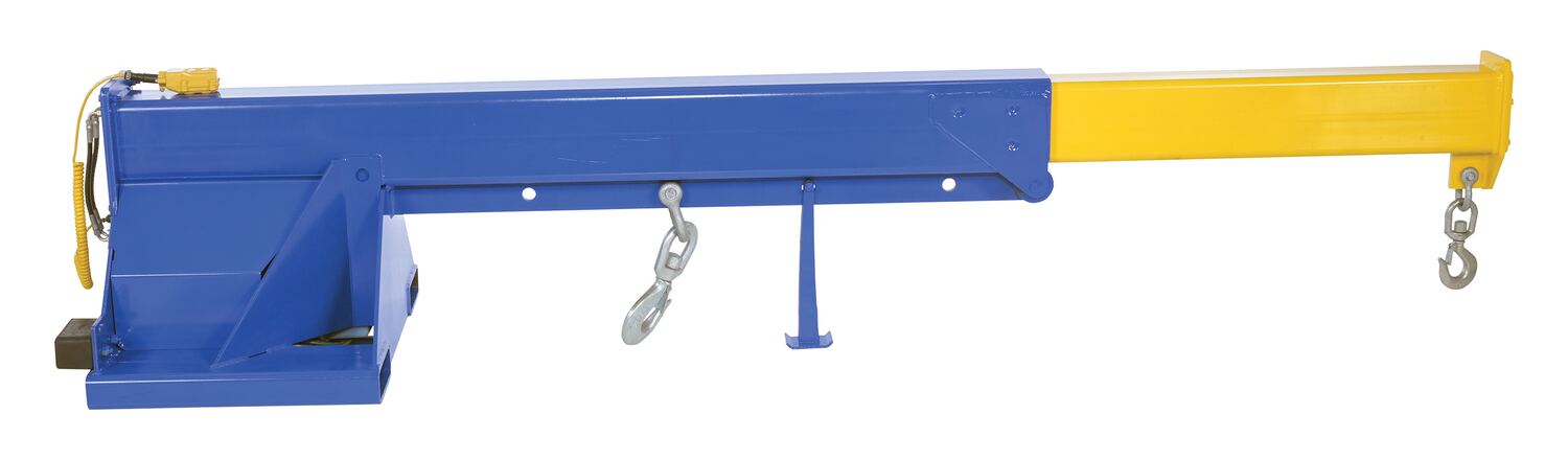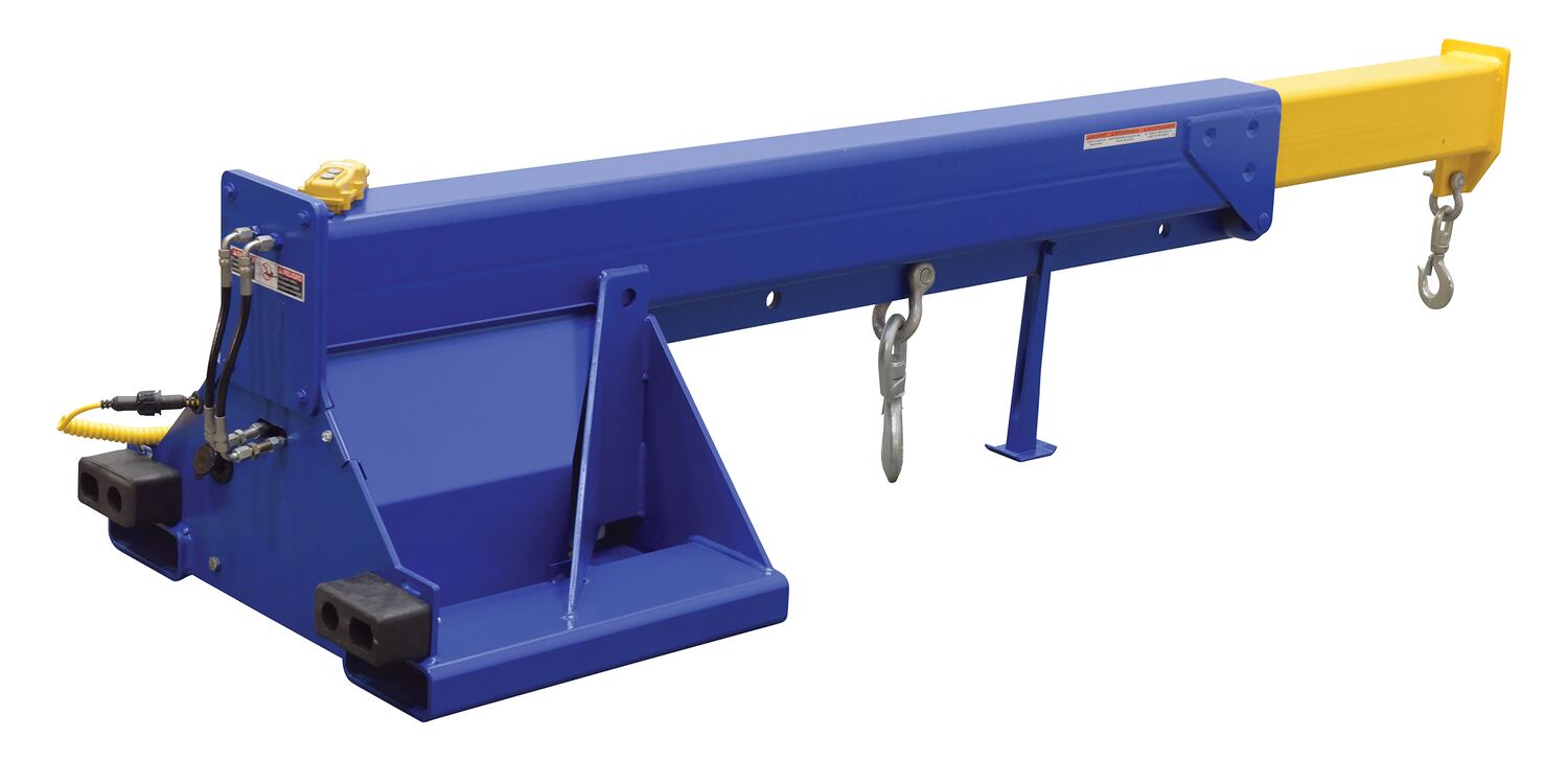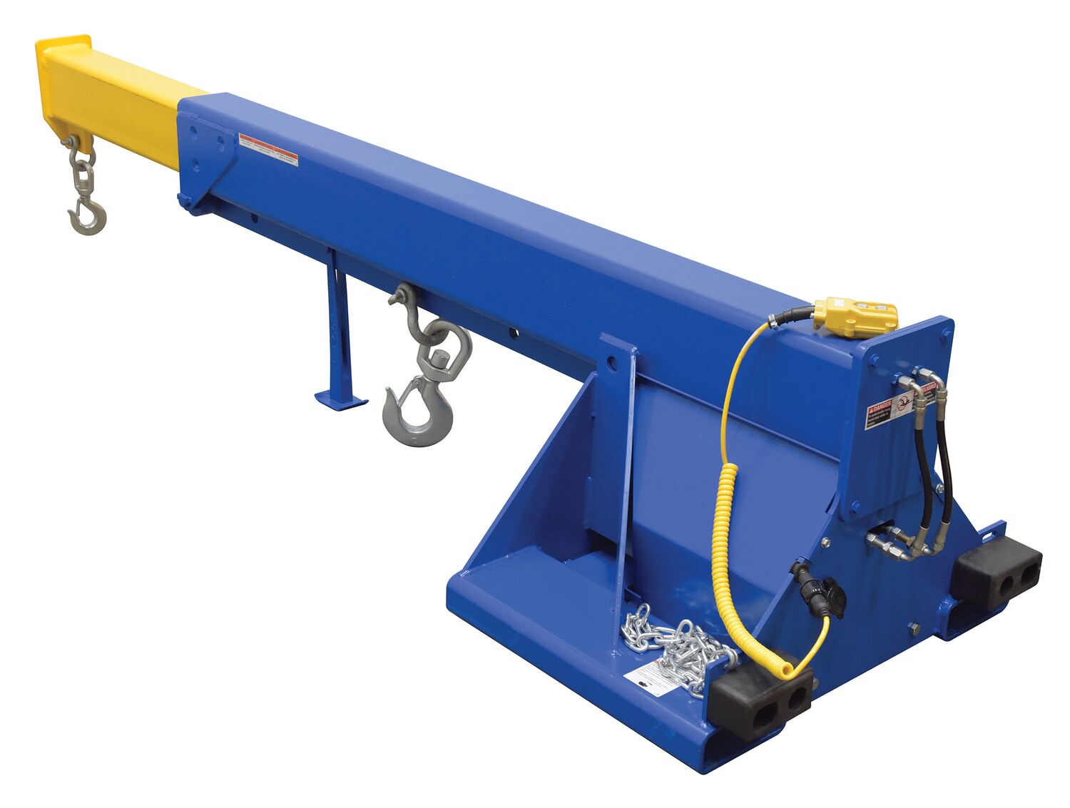 Steel Hydraulic Telescoping Boom 12 Volt DC 24 In. Fork Pocket Center 8,000 Lb. CapacityThe DC powered telescoping boom has all the benefits of the standard lifting boom, except now it has the capability of being powered. The DC powered design includes a power unit housed between the fork tubes and the outer boom. By using the handheld controller the boom can be extended or retracted. The hand held controller connects to the power unit via a pigtail cord. Painted for a smooth finish and to limit abrasion. Includes two (2) lifting hooks.