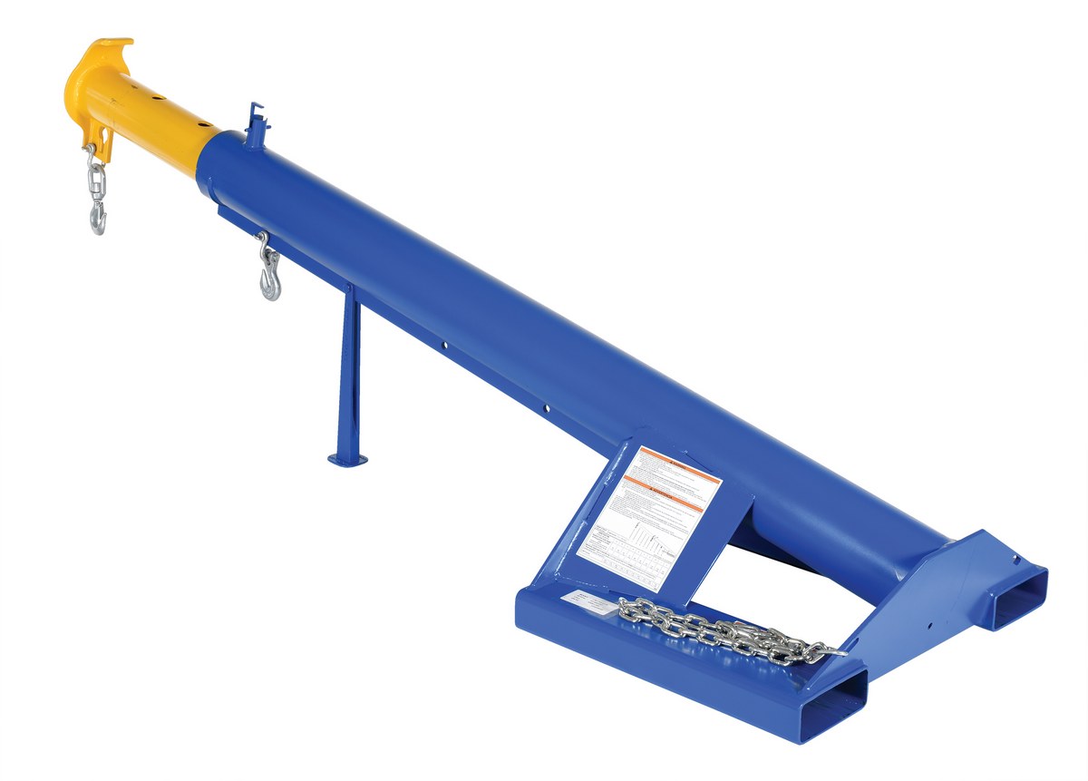 Steel Lift Master Boom 24 In. Fixed 15 Degrees 4,000 Lb. Capacity Blue and YellowUnique performance, convenience, and safety features are built into every lift master boom. Fabricated from structural steel with welding to meet AWS creates a rugged and durable boom that will provide long term service. A safety restraint secures the boom to the fork truck for safe operation. Includes two (2) lifting hooks.