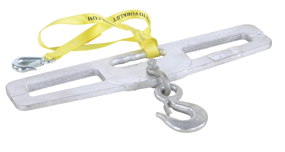The hook plate enables any fork truck to safely lift a load using chains, cables, or slings. Features slanted fork openings to prevent the hook plate from being used upside down. A hook with anchor shackle is included.