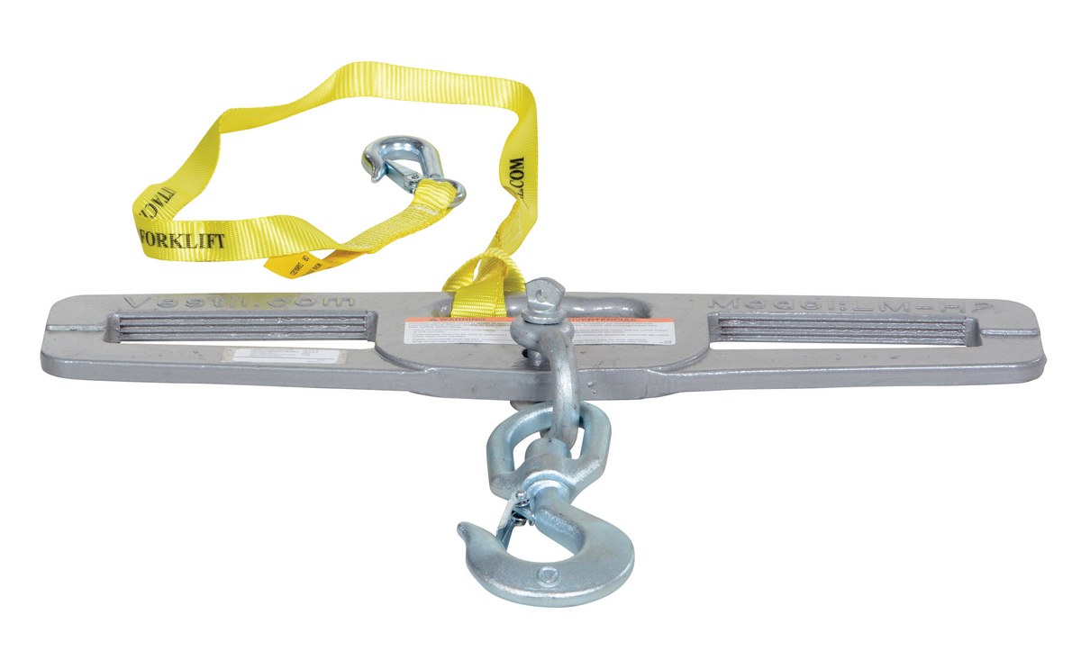The hook plate enables any fork truck to safely lift a load using chains, cables, or slings. Features slanted fork openings to prevent the hook plate from being used upside down. A hook with anchor shackle is included.