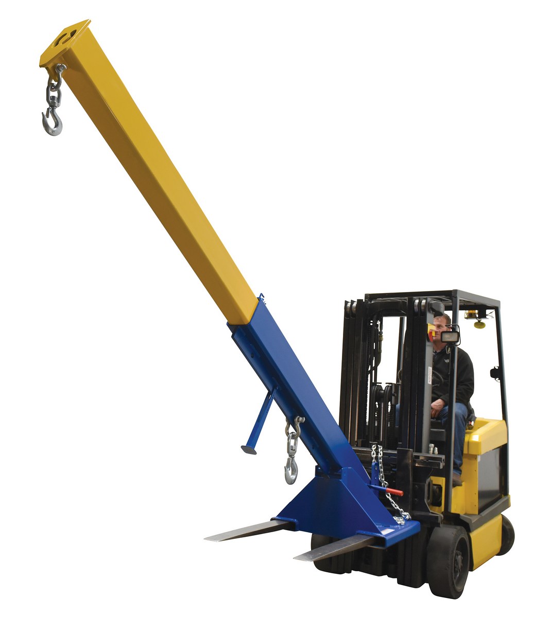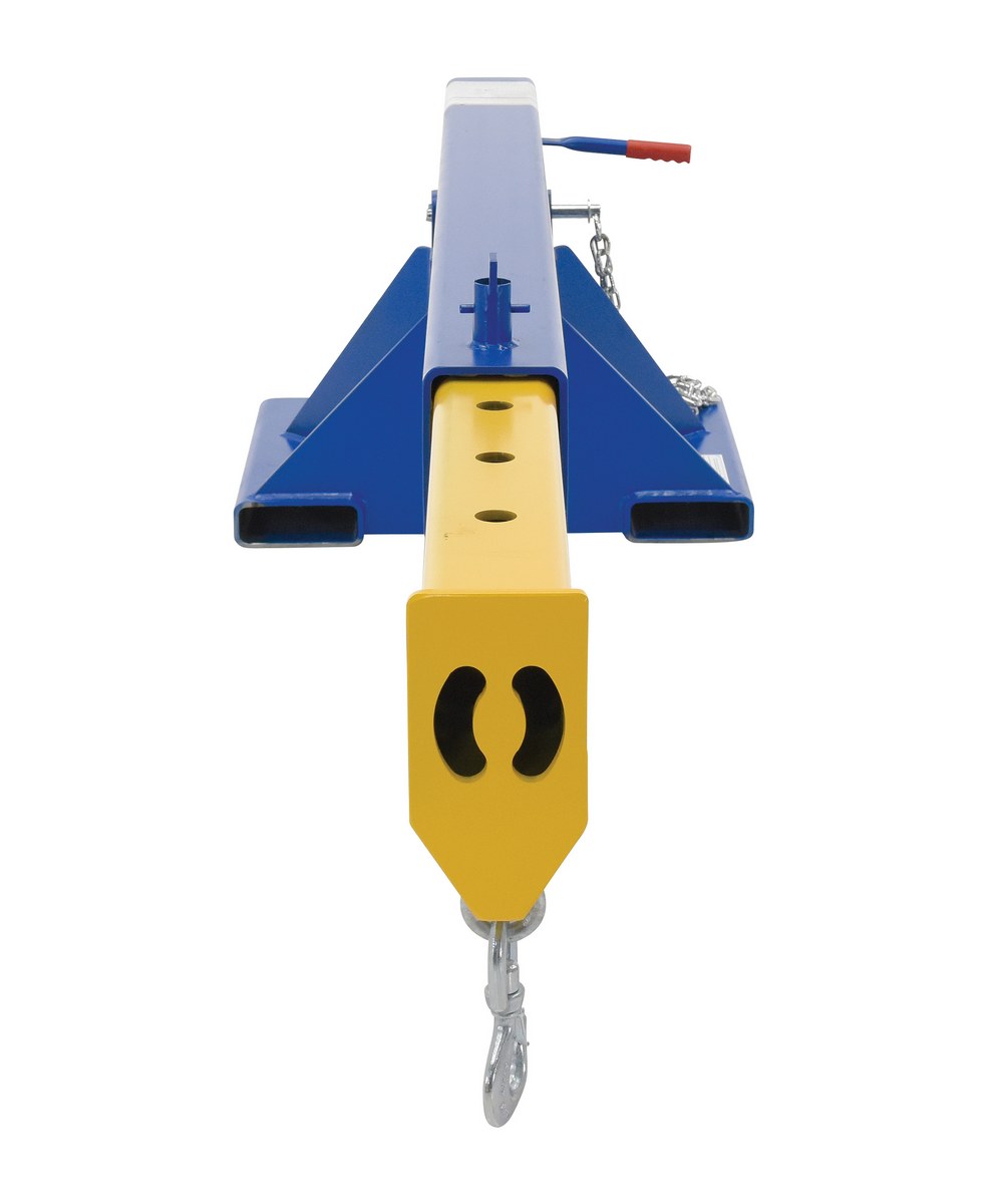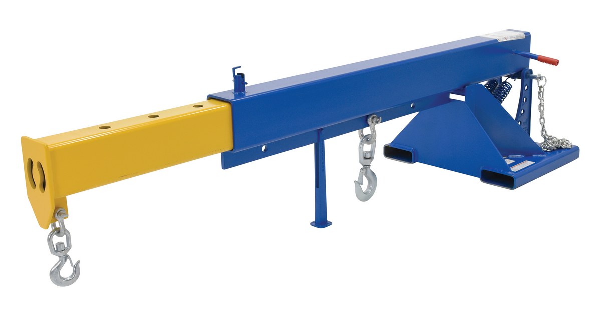 Steel Orbit Telescoping Lift Boom 24 In. Fork Pocket Center 8,000 Lb. Capacity BlueUnique performance, convenience, and safety features are built into every lift master boom. Fabricated from structural steel with welding to meet AWS creates a rugged and durable boom that will provide long term service. A safety restraint secures the boom to the fork truck for safe operation. Includes two (2) lifting hooks.