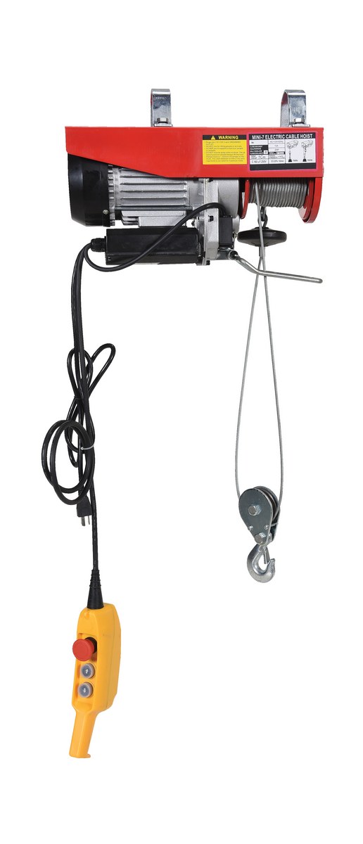 Steel Mini Cable Hoist Option 16 In. x 6-1/4 In. x 10 In. 750 Lb. Capacity RedThis mini cable hoist can be used in both single-line and double-line lifting applications. Includes electric motor and hand-held push button controls. Optional swivel hook plate must be ordered for attaching hoist to trolley, (trolley not included).